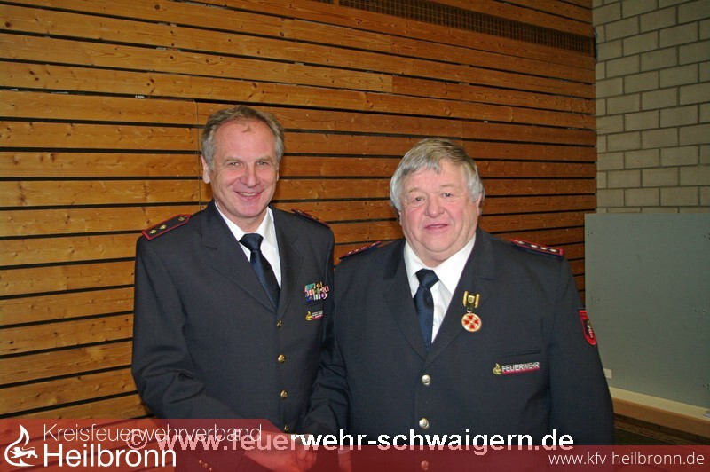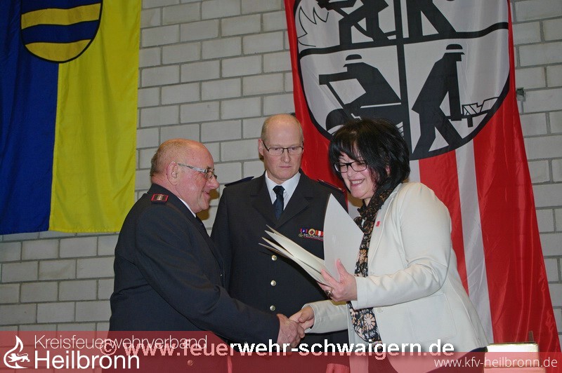 Die Jugendfeuerwehr von Schwaigern war 1980 eine der ersten überhaupt im Landkreis. Heute gehören ihr 52 Jugendliche an. Auf den Weg gebracht hatten diese Martin Freudenthaler und Gunter Lang. „Es zeigten immer mehr Jugendliche, auch aus den Stadtteilen, Interesse, deswegen boten sie immer mehr Aktivitäten, um die Attraktivität zu steigern“, erinnert Bürgermeisterin Sabine Rotermund. 2006 rief Lang dann auch noch die Kinderfeuerwehr (derzeit 15 Mitglieder) ins Leben. Beide sind nun Ehrenmitglieder der Schwaigerner Wehr. Helmut Gogel ist gar Ehrenkommandant. Seit 47 Jahren ist er dabei, 20 Jahre lang hatte er die Abteilung Massenbach geführt, war für viele zum Vorbild geworden. Dafür zeichnet ihn Gall zusätzlich mit der Ehrenmedaille in Silber des Landesfeuerwehrverbandes aus. Das Feuerwehrabzeichen in Silber des Landes für 25-jährige aktive Dienstzeit erhalten Thorsten Kissinger, Herbert Decker und Klaus Ganßer. Gold wird dieses nach 40 Jahren wie bei Martin Boger und Harald Schuster. Der Kreisfeuerwehrverband ehrt Wilhelm Essig mit der Ehrennadel für besondere Verdienste.