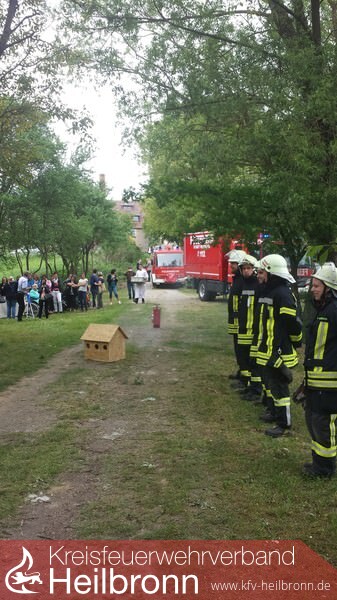 So wurde ein kleines Brandhäuschen angezündet, das die Zwei dann mit der Kübelspritze löschen mussten.