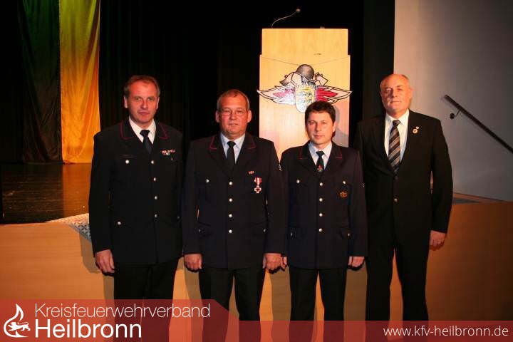 Bild: Der Vorsitzende des Kreisfeuerwehrverbandes Heilbronn, Reinhold Gall (links), der stellvertretende Kommandant Bernd Ehrhardt und Bürgermeister Ulrich Ruoff (rechts) gratulieren Franz Schuster (zweiter von links). (Foto: Heinz Schmierer)