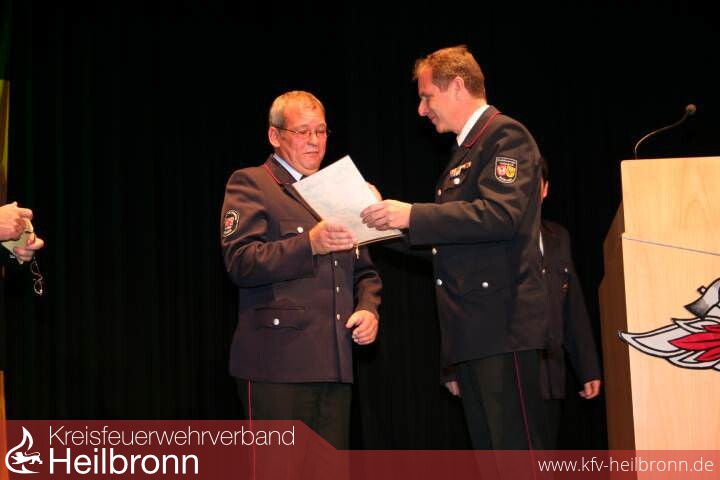 Auch der Vorsitzende des Kreisfeuerwehrverbandes Reinhold Gall lobte die nun schon fast 24-jährige erfolgreiche Arbeit von Schuster in der Führungsverantwortung der Wehr und dankte ihm neben allen wichtigen Entscheidungen insbesondere für die Gründung der Jugendfeuerwehr im Jahre 2002. Für diese Verdienste verlieh er dem Oedheimer Kommandant die Ehrennadel des Kreisfeuerwehrverbandes Heilbronn.