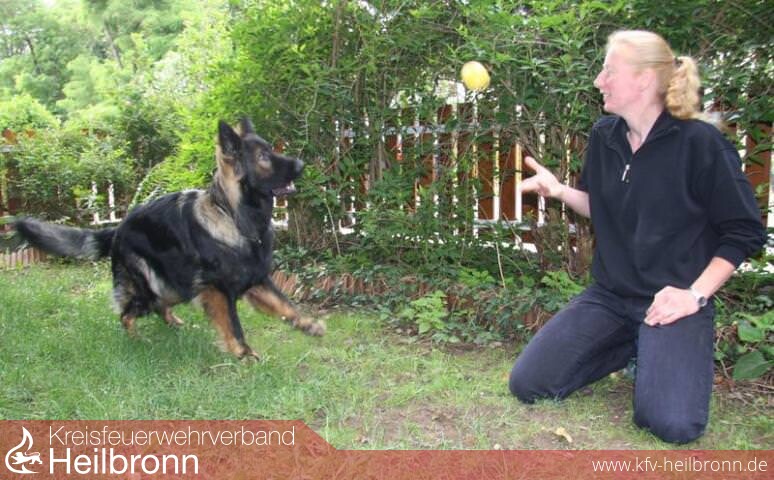 Bild: Aufspüren und verbellen, aber nicht berühren: Mit einem Ball üben Susanne Tismer und ihr Schäferhund Ivo, was ein Rettungshund können muss. (Foto: Waltraud Langer)