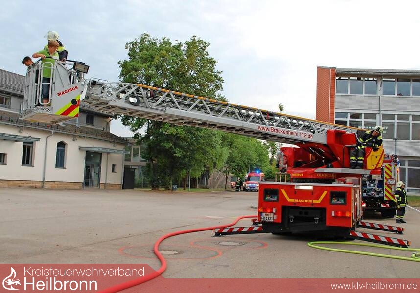 Beißender Geruch im Treppenhaus. Im Gang zu den Klassenräumen sind die Rauchschwaden so dicht, dass man nicht mal mehr etwas sehen kann. Schon ertönen die Sirenen der Feuerwehr. Nur wenige Augenblicke später treffen die Löschfahrzeuge auf dem Schulhof ein. „Hilfe, hier sind wir“, ruft eine Lehrerin aus dem ersten Obergeschoss und schwenkt weithin sichtbar eine rote Karte. Kommandant Peter Hügle ordnet sofort die Rettung per Drehleiter an: Im Rahmen einer spannenden Übung holt die Freiwillige Feuerwehr Brackenheim am Mittwochabend knapp 50 Viertklässler aus der Theodor-Heuss-Grundschule.