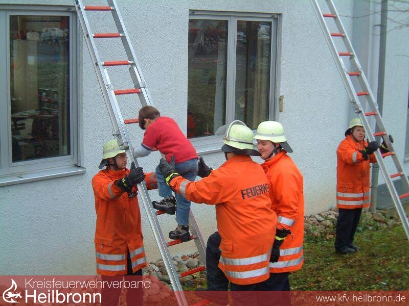 Der erste Einsatzwagen trifft ein und hält an der Nordseite der Schule. Schnell sind die Steckleitern an die Fenster gestellt. Die Wehrmänner bringen eine Klasse sicher auf den Boden. Auch auf der Südseite des Gebäudes laden die Floriansjünger das Arbeitsgerät aus dem Einsatzwagen. Während zwei Männer mit Atemschutzgerät ins Gebäude gehen, bauen die anderen die Rettungsleiter und die Wasserversorgung auf. Der betroffene Raum liegt in fast sieben Metern Höhe. Jedes der Kinder muss deshalb vor der Rettung angeseilt werden - ein enormer Zeitaufwand. Oben, im Klassenzimmer der 3a, stehen die Jungen und Mädchen in der Rettungsschlange . Und so manchem Kind wird ganz schön mulmig, als es den Schritt aus dem Fenster machen muss.