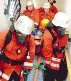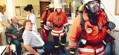 Bild 1: Wer kann durch welchen Fluchtweg wie gerettet werden? Im Pflegeheim ist die Lage schwierig. Tragen oder auch Stühle dienen als Transportmittel.Bild 2: Eine bettlägerige Patientin wird von den Rettungskräften aus dem Zimmer...Bild 3: ...gebracht und auf einer Trage durchs Treppenhaus ins Freie getragen. (Fotos: Ralf Seidel)