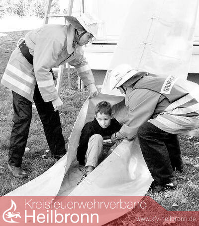 Doch selbst wenn nichts brennt, der Einsatz läuft: Schläuche werden ausgerollt, Maschinen pumpen Wasser, Verletzte werden auf Tragen aus dem Haus gebracht, und Feuerwehr-Männer setzen Atemgeräte auf.Die Kinder im ersten Stock werden wie bei einem echten Brand gerettet: an der Hauswand runter. Ein Feuerwehrtrupp schleppt im Laufschritt eine Leiter an und stellt sie unter das Fenster mit den Kindern. Ein paar Männer klettern hoch, ihre Kollegen unten rollen unterdessen einen 25 Meter langen Rettungsschlauch aus und ziehen ein Ende zu den Schülern nach oben.