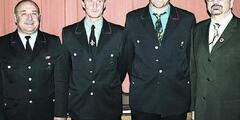 Foto: Hardthausens Bürgermeister Harry Brunnet (rechts) und Feuerwehr- Gesamtkommandant Berthold Wirth (links) ehren Stefan Herkert und Karl-Heinz Mack, Reinhold Knorr fehlt. (Foto: Agentur Kochertal)