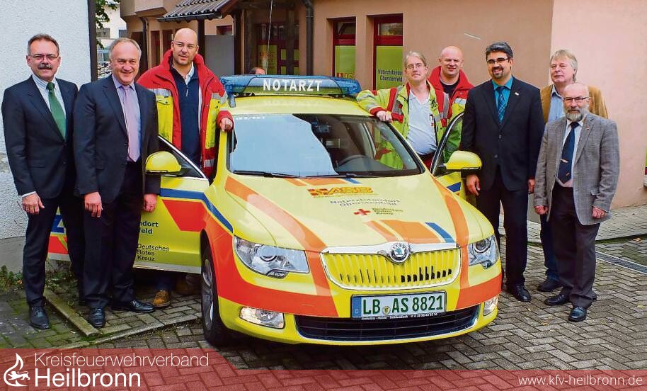 Bild: Das neue Notarzteinsatzfahrzeug wird von Bürgermeister Reinhard Rosner, Dr. Manfred Frenzel, Heiko Schulz, Christof Hoffmann, Dr. Marcus Michna, Daniel Groß, Hans-Ulrich Oppenländer und Karl-Eugen Altdorf (v.li) vorgestellt. (Foto: Wolfgang Seybold)