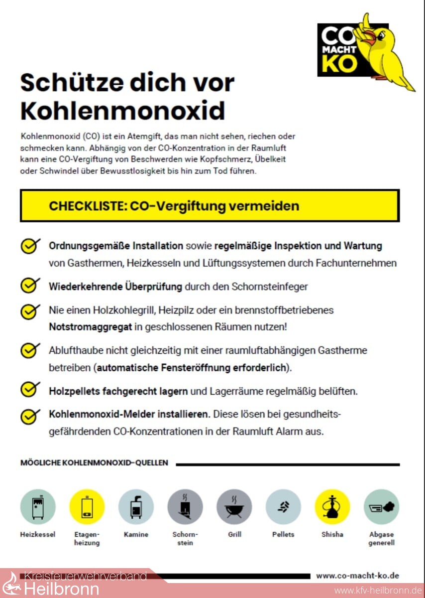 Die Initiative zur Prävention von Kohlenmonoxid-Vergiftungen klärt Verbraucher auch 2020 wieder mit einer Online- und Presse-Kampagne vom 3. bis 7. Februar 2020 über die Vermeidung einer Kohlenmonoxid-Vergiftung und mögliche Gefahrenquellen auf. Experten haben dazu eine Checkliste entwickelt, die zentrale Kohlenmonoxid-Gefahren im Haushalt zusammenfasst und konkrete Tipps zum Schutz von CO-Vergiftungen gibt.