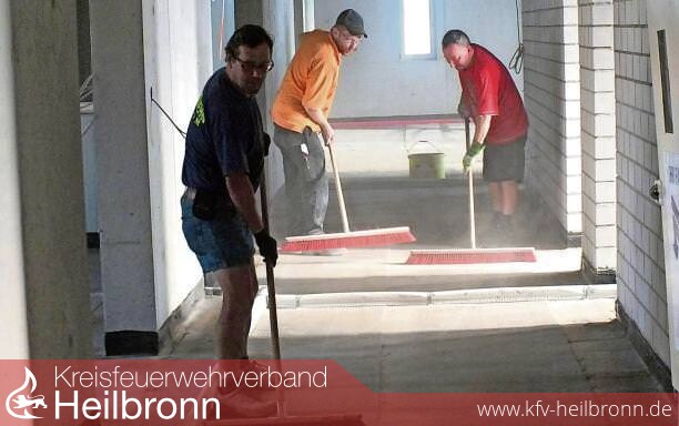 Bild: Bevor der Estrich kommt, machen die Talheimer Feuerwehrleute erst mal richtig sauber ? und sparen so eine Menge Kosten für die Reinigungsfirma. (Foto: Weimar)