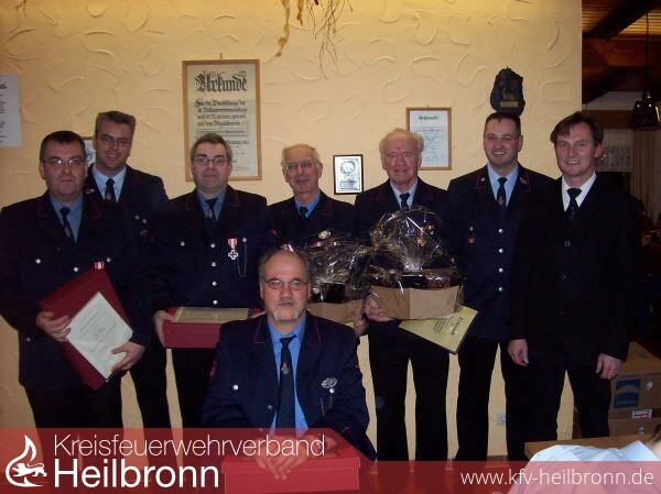 Bild von links nach rechts: Walter Müller, stellv. Kommandant Alexander Schüßler, Hans-Peter Rensky, Oliver Schuth, Guido Müller, Willi Hutt, Kommandant Matthias Schüßler und Bürgermeister Schulz