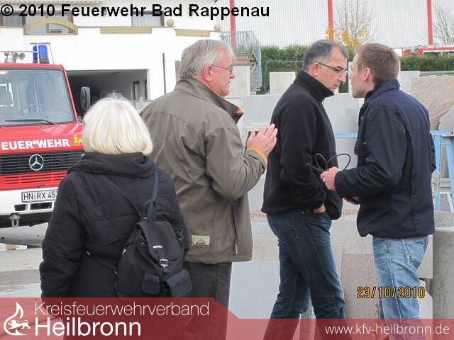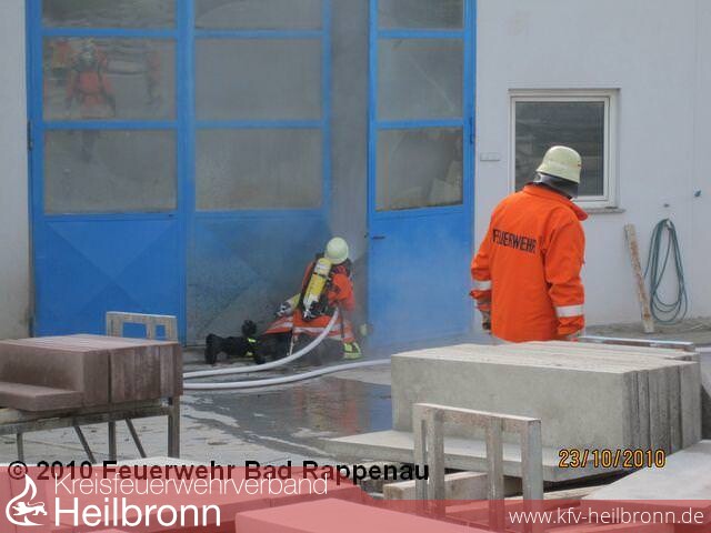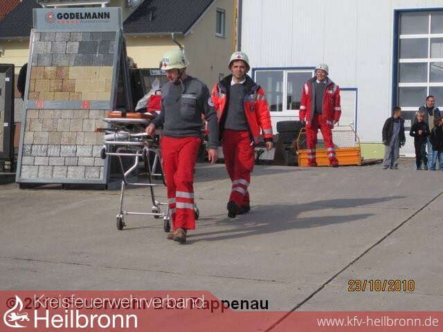 Am Samstag, den 23.10.2010 wurden für die Abteilungen Obergimpern und Wollenberg der Feuerwehr Bad Rappenau um 14:00 Uhr über DME und Sirene Alarm zur Jahreshauptübung ausgelöst. Angenommen war eine Großschadenslage im Betonwerk Gabel in Obergimpern. Ein Brand auf dem Freigelände und vermisste Personen in 2 verschiedenen Werkhallen stellten das Übungszenarion dar. Durch den Gruppenführer des Löschfahrzeuges LF 8/6 der Abt. Obergimpern wurde nach dem Eintreffen an der Einsatzstelle umgehend die Menschenrettung in Halle 1 unter Atemschutz veranlasst. Als nachrückende Kraft übernahm das Löschfahrzeug LF 8/6 der Abt. Wollenberg mit den Kameraden die Brandbekämpfung auf dem Freigelände. Nachdem die vermissten Personen aus Halle 1 geborgen und den anwesenden Kräften des DRK Ortsverein Obergimpern zur weiteren Versorgung übergeben waren wurde umgehend die Suche nach weiteren Personen in Halle 2 fortgesetzt. Auch in Halle 2 wurden weiteren Personen geborgen und dem DRK übergeben.