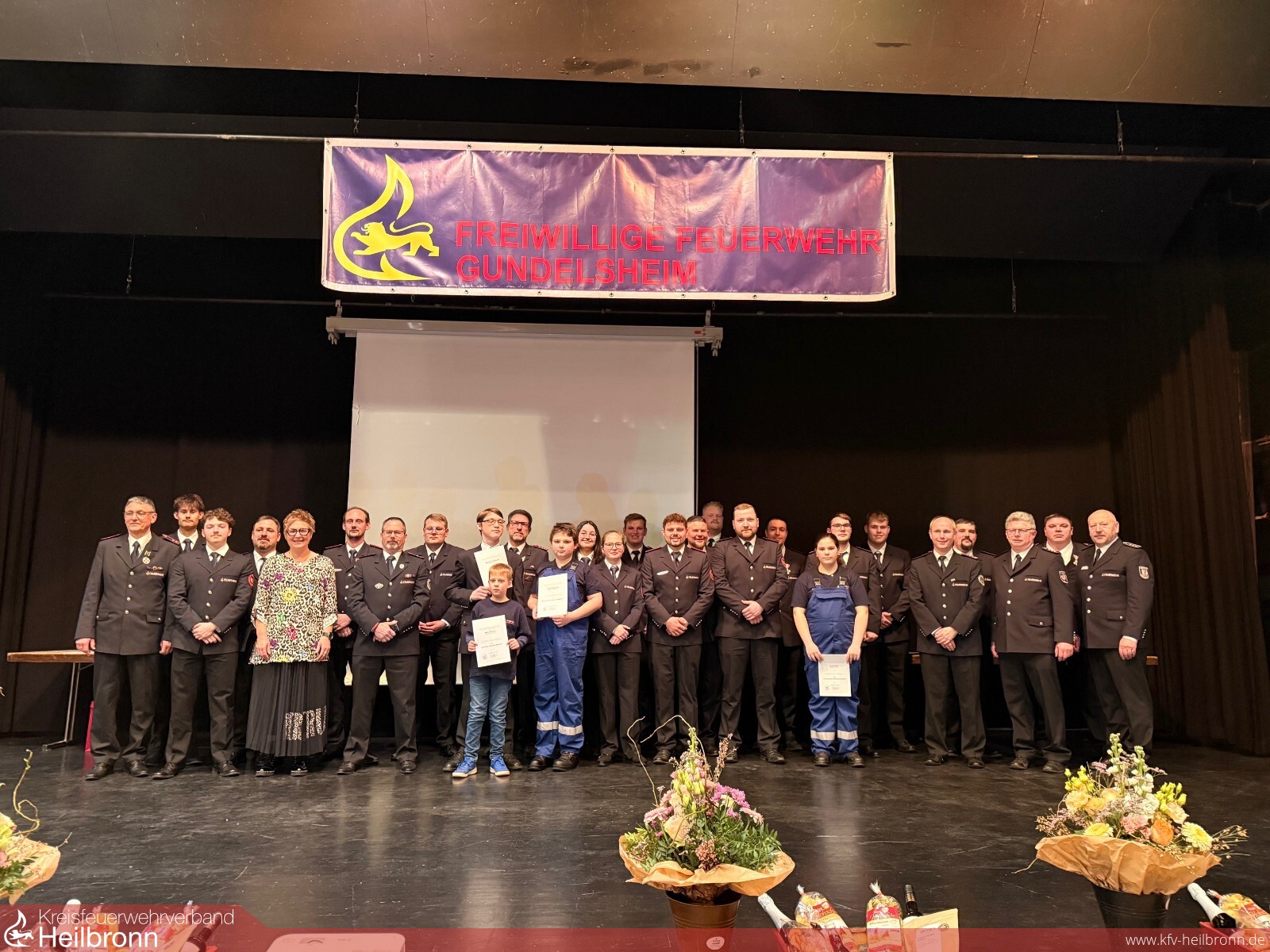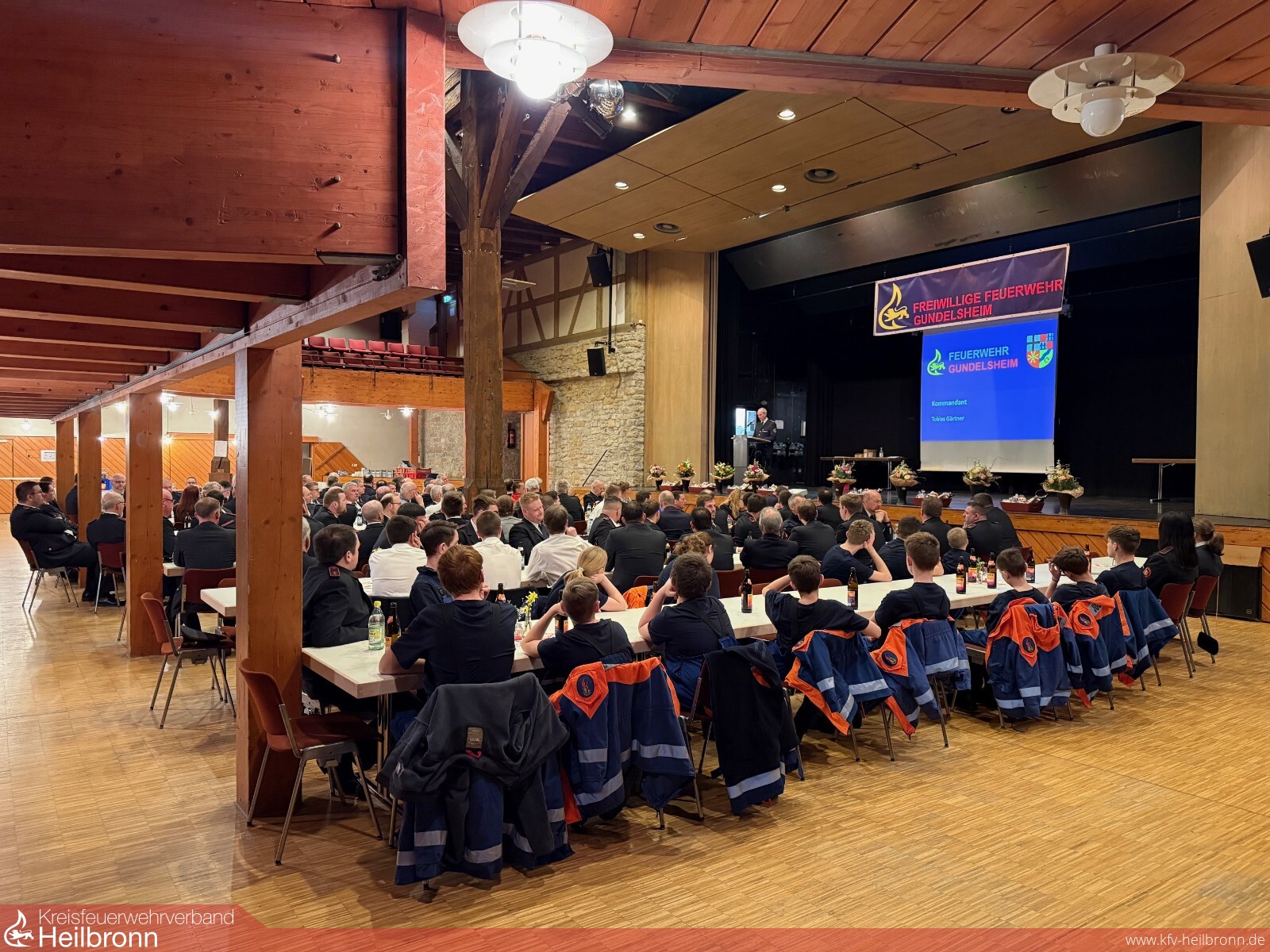 Am Samstag, den 21.03.2026 fand die diesjährige Jahreshauptversammlung der Freiwilligen Feuerwehr Gundelsheim in der Deutschmeisterhalle statt. Um 19 Uhr eröffnete Kommandant Tobias Gärtner die Veranstaltung. Nach der Begrüßung folgte ein Übersicht über den aktuellen Personalstand in Gundelsheim. Im Berichtsjahr 2025 konnten 9 neue Mitglieder in der Einsatzabteilung eingestellt werden, sodass nun 167 aktive Feuerwehrmänner sich um das Wohl in Gundelsheim bemühen. Aber auch die Kinder- und Jugendfeuerwehr ist mit 39 Mitgliedern gut für die Zukunft aufgestellt. Außerdem sind 36 Alterskameraden in der Altersabteilung vertreten.