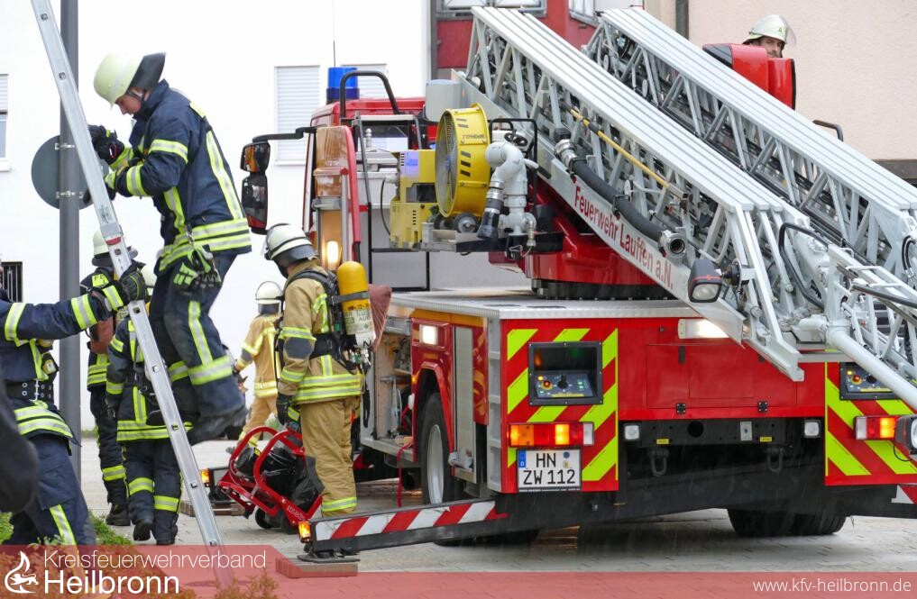 Drehleiter Die Feuerwehr Lauffen hat mittlerweile den Drehleiterwagen im Außenbereich positioniert und bringt die Bewohner der oberen Etage mit dem Korb sicher nach unten. Die Personen der mittleren Etage werden über Stellleitern gerettet. Ein weiterer Trupp belüftet das Treppenhaus. Zwei im Gebäude aufgegriffene Bewohner werden mit Fluchthauben ausgestattet und jeweils mit dem Atemschutzgerät eines Feuerwehrmannes gekoppelt. So können sie nach draußen begleitet und den Rettungssanitätern übergeben werden.
