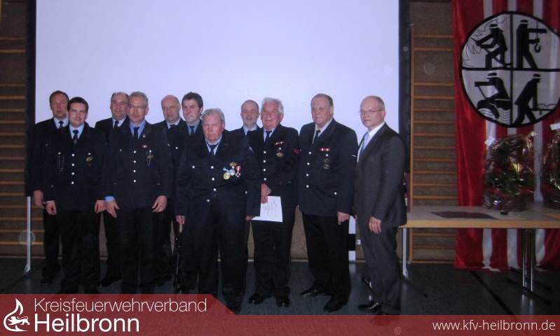 Bild 2:Ehrungen und gewählte Führung der Feuerwehr Neuenstadt 2012Abt.kdt. Roland Grünagel, Tobias Lehnert, KBM Uwe Vogel, Stellv. Kdt. Klaus Gussmann, Kdt. Hartmut Schaffroth, Hartmut Dierolf (25 Jahre), Emil Apfelbach (60 Jahre), Lothar Vogt (scheidender Abt.kdt. Stein/Kochertürn), Walter Keilbach (60 Jahre), Horst Hofmann (50 Jahre), Bürgermeister Norbert Heuser