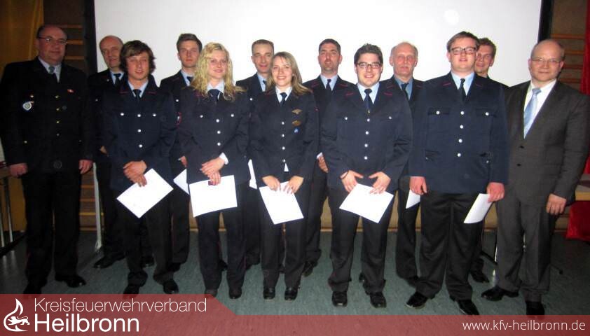 Bild 1: Beförderungen Feuerwehr Neuenstadt 2012KBM Uwe Vogel, Kdt. Hartmut Schaffroth, Fabian Schadt, Christian Birk, Katja Weber, Daniel Göltenboth, Julia Schaffroth, Andreas Küstner, Patrick Holl, Martin Volpp, Kai Schneider, Andreas Gaumann, Bürgermeister Norbert Heuser