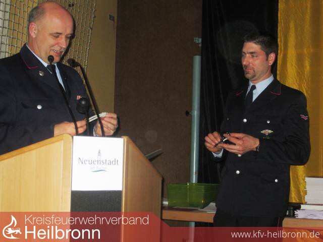 Bürgermeister Norbert Heuser und Kreisbrandmeister Uwe Vogel ehrten bei der Hauptversammlung verdiente Mitglieder der Freiwilligen Feuerwehr Neuenstadt. Hartmut Dierolf ist seit 25 Jahren im aktiven Dienst dabei und absolvierte bereits drei Mal das goldene Leistungsabzeichen. Er wurde mit dem Feuerwehrehrenzeichen in Silber vom Land Baden-Württemberg ausgezeichnet.