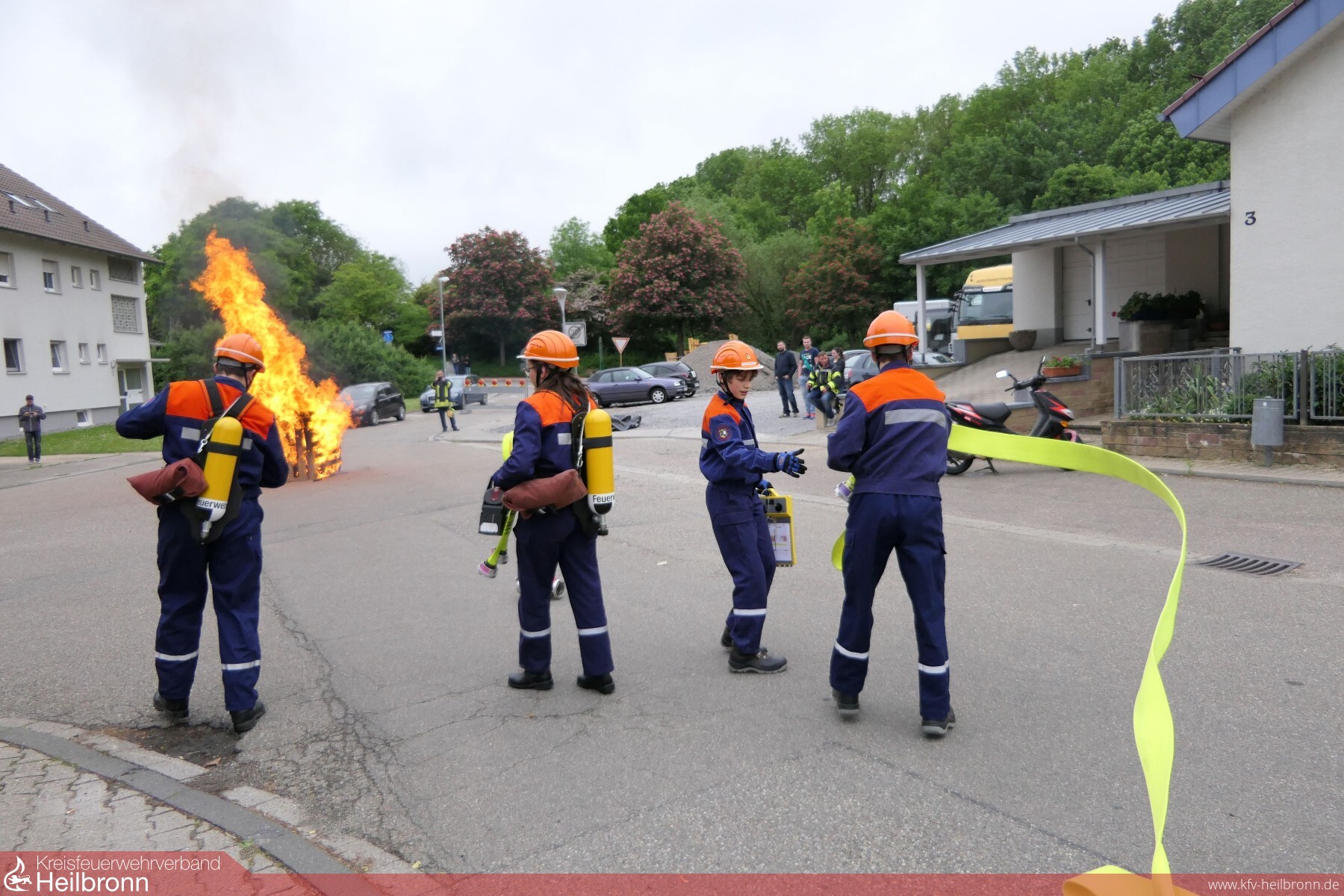 Anlässlich des Dorfplatzfestes der Feuerwehr Gemmingen, Abteilung Stebbach zeigte die Jugendfeuerwehr am Nachmittag des 10. Mai 2018 eine Schauübung vor dem Feuerwehrhaus. Unzählige Zuschauer warteten gespannt darauf bis das Löschgruppenfahrzeug mit Blaulicht und Martinshorn angefahren kam, um das brennende Haus zu löschen. Mit Atemschutzgerät, Handlampe und Leinenbeutel ausgerüstet begann der Angriffstrupp Schläuche auszurollen und das 1. Rohr aufzubauen. Gleichzeitig erfolgte der Aufbau der Wasserversorgung vom Hydrant über Fahrzeugpumpe bis zum Verteiler durch den Wassertrupp. Nachdem die Brandbekämpfung durch den Angriffstruppe begonnen hatte, rüstete sich der Wassertrupp ebenfalls aus und ging mit dem 2. Rohr zur Brandbekämpfung vor. Durch den Melder wurde der Verteiler bedient und die Atemschutzüberwachung durchgeführt. Unter Einsatz von zwei C-Rohren war das Feuer schnell unter Kontrolle und abgelöscht, was durch die Zuschauer mit Applaus honoriert wurde. Über den gesamten Verlauf der Schauübung kommentierte Michael Bayer, Abteilungskommandant der Abteilung Stebbach, die Vorgehensweise der Jugendfeuerwehr.