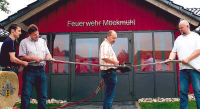 Bild: Feuerwehrkommandant Uwe Thoma schneidet statt eines Bandes Löschschläuche mit einer hydraulischen Schere durch. (Foto: David Binnig)