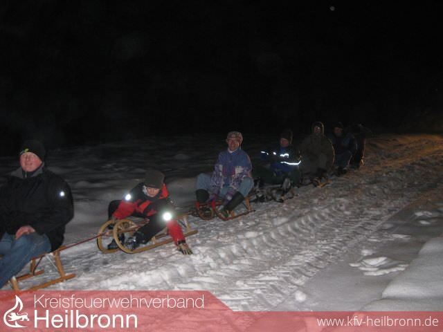 Da die Kameradschaft auch im 125ten Jahr des Bestehens der Feuerwehr Lehrensteinsfeld gefördert werden soll, organisierte Feuerwehrmann Christian Stein eine Schlittenausfahrt mit zwei Traktoren. Bei schönem Winterwetter starteten 13 Kameraden zum Teil mit Begleitung am Freitagabend um 19.00 Uhr zu einer Ausfahrt. Mit sehr viel Spaß ging es über schneebedeckte Feldwege rund um Lehrensteinsfeld. Gegen 21.00 Uhr kehrten die Teilnehmer ins Feuerwehrhaus zurück, wo schon Glühwein und Würstchen zur Stärkung bereit standen. In gemütlicher Runde mit vielen Gesprächen über das bevorstehende Jubiläumswochenende am 16. bis 18. April beendete man den Abend.