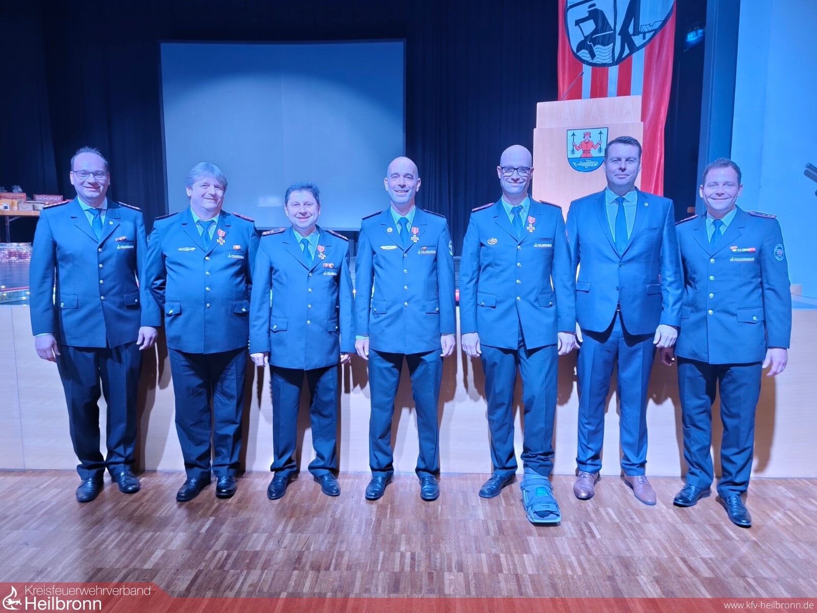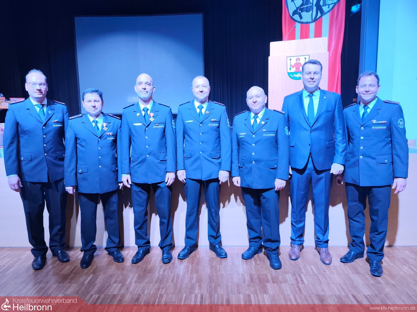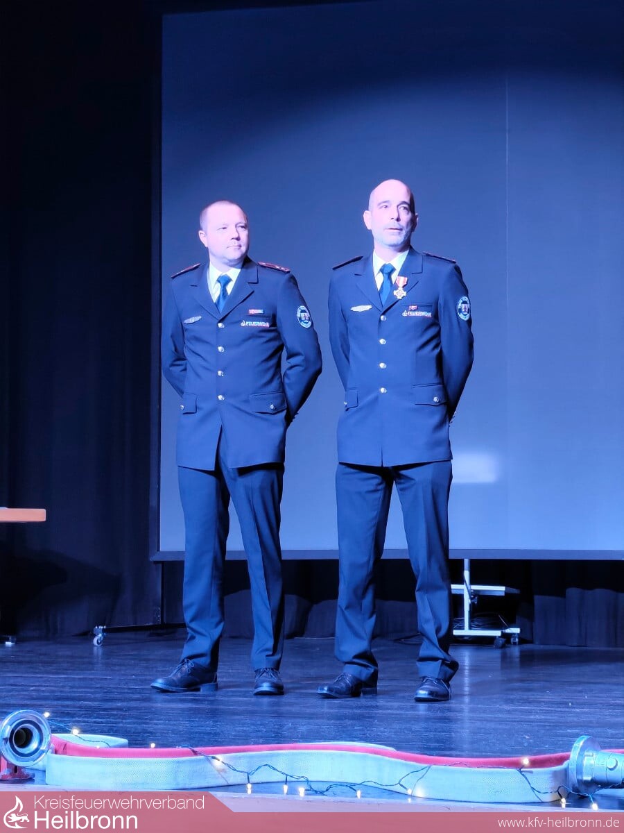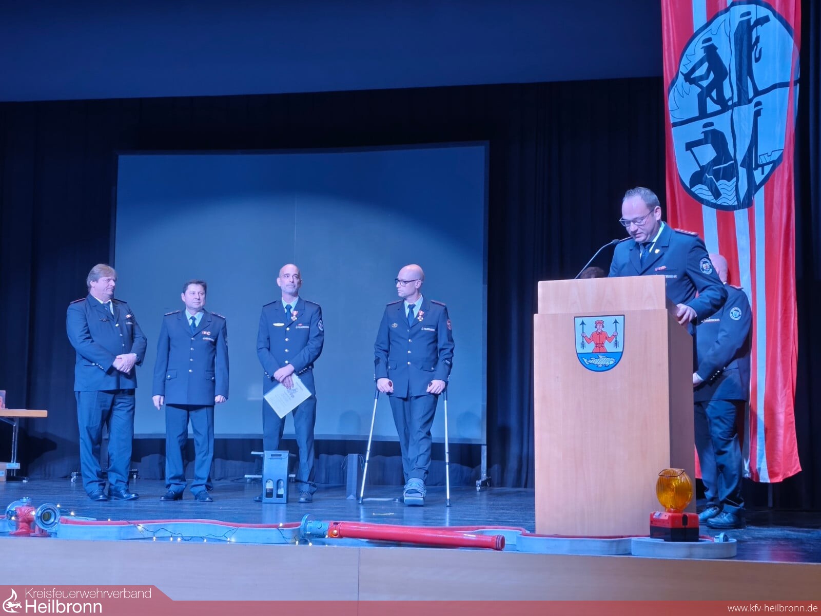Eine besondere Ehrung erhielten Stefan Deckert und Sven Rathsam. Ihnen wurde die Ehrennadel des Kreisfeuerwehrverbands Heilbronn für ihre langjährigen und besonderen Verdienste verliehen. Als Partner der Feuerwehr wurden die Firmen csi entwicklungstechnik GmbH, Elektro Glaser und Enderer GmbH geehrt.