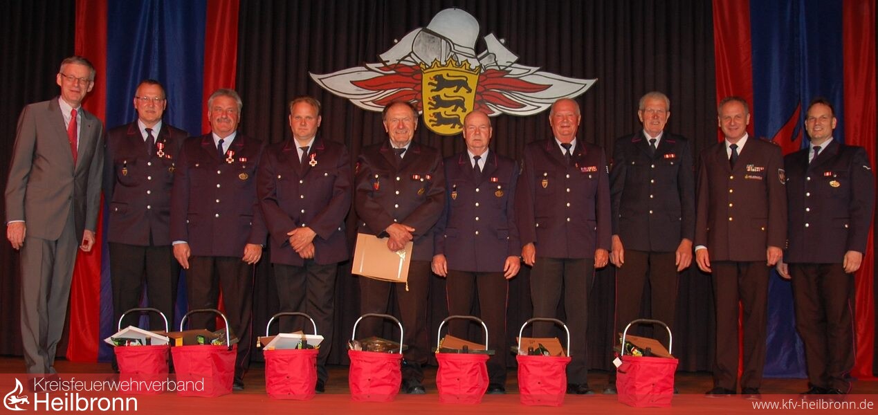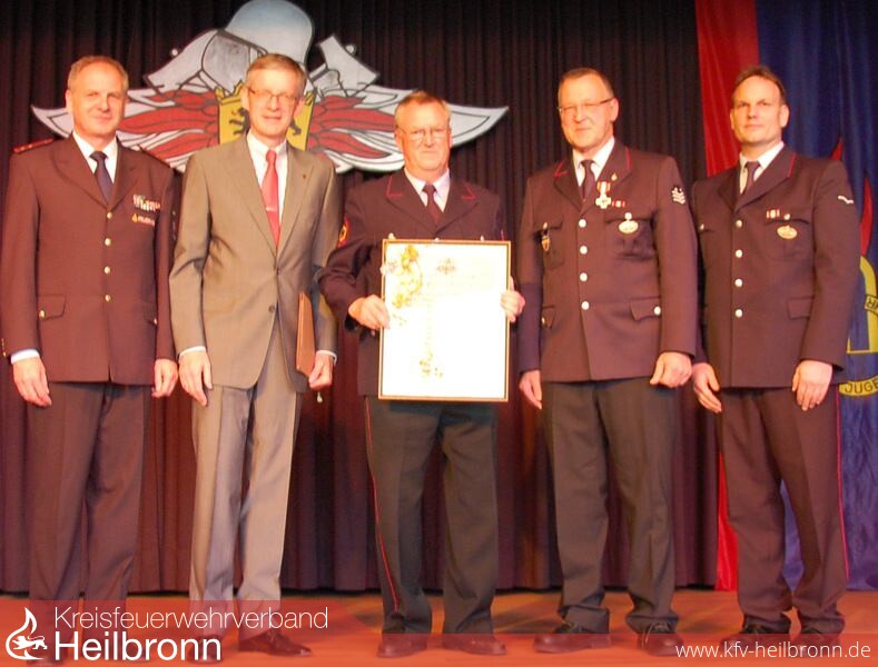 Am Kameradschaftsabend werden traditionell verdiente Mitglieder für ihre langjährige Treue ausgezeichnet. Innenminister Reinhold Gall nutzte die Gelegenheit, um die Wichtigkeit der ehrenamtlichen Arbeit der Feuerwehren hervorzuheben. Er ließ in seiner Laudatio für die Geehrten seine Gedanken in die Vergangenheit schweifen und beschrieb, welche umfangreichen Entwicklungen gerade das Feuerwehrwesen in den letzten 60 Jahren geprägt hat. Gerade die Chronologie der Wimpfener Feuerwehr zeige, dass man in Sachen Ausstattung immer den anderen Wehren im Landkreis voraus war. Es bedarf aber auch engagierter Menschen, die diese Entwicklung vorantreiben, so war Bad Wimpfen eine der ersten Wehren im Landkreis unter ihrem damaligen Kommandanten Reinhold Korb, die eine Jugendfeuerwehr und sogar die Erste, die eine Kinderfeuerwehr gegründet hatten. Innenminister Gall und Bürgermeister Brechter überreichten Michael Staudt das Feuerwehrehrenzeichen des Landesfeuerwehrverbandes in Silber für 25-jährige Zugehörigkeit. Für 40 Jahre Mitgliedschaft erhielten Reinhard Gayer und Kommandant Ramsperger das Feuerwehrehrenzeichen in Gold.