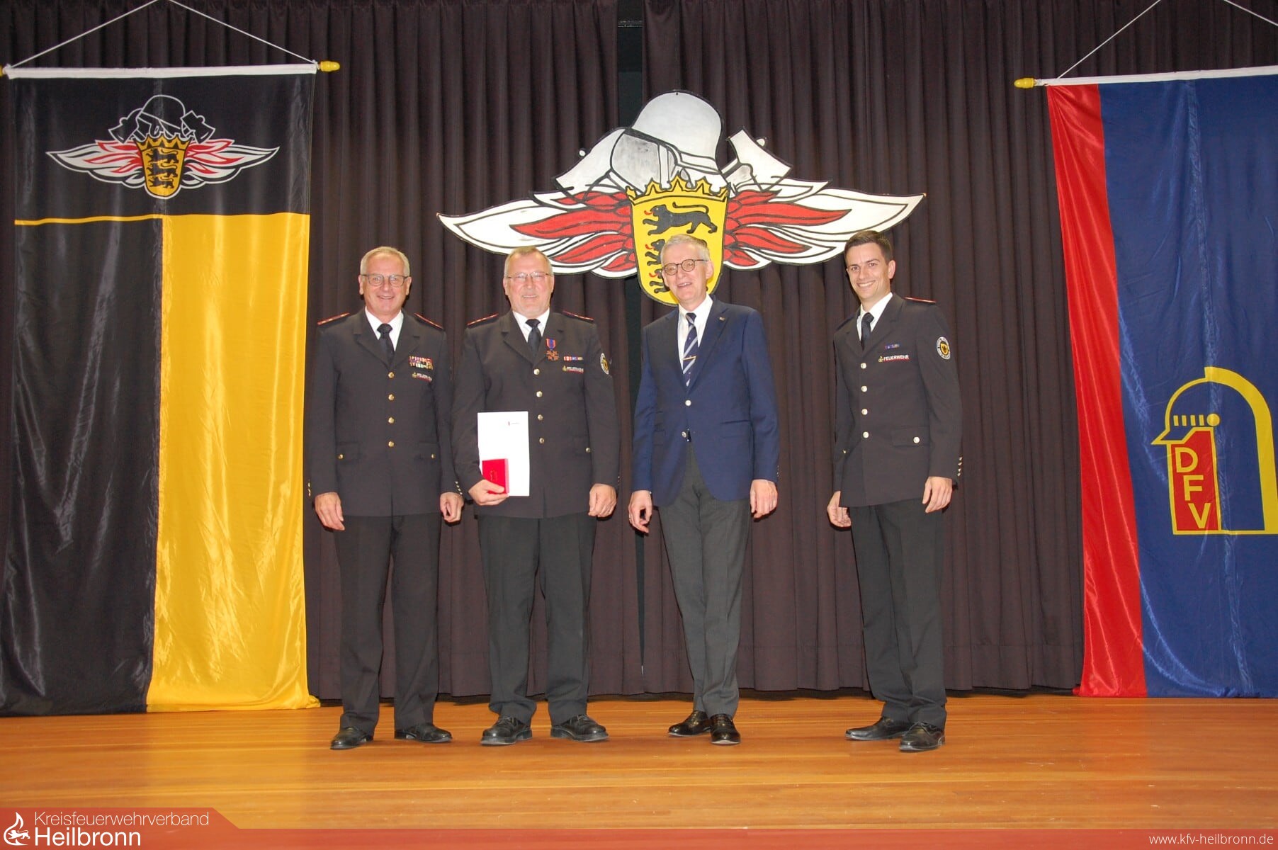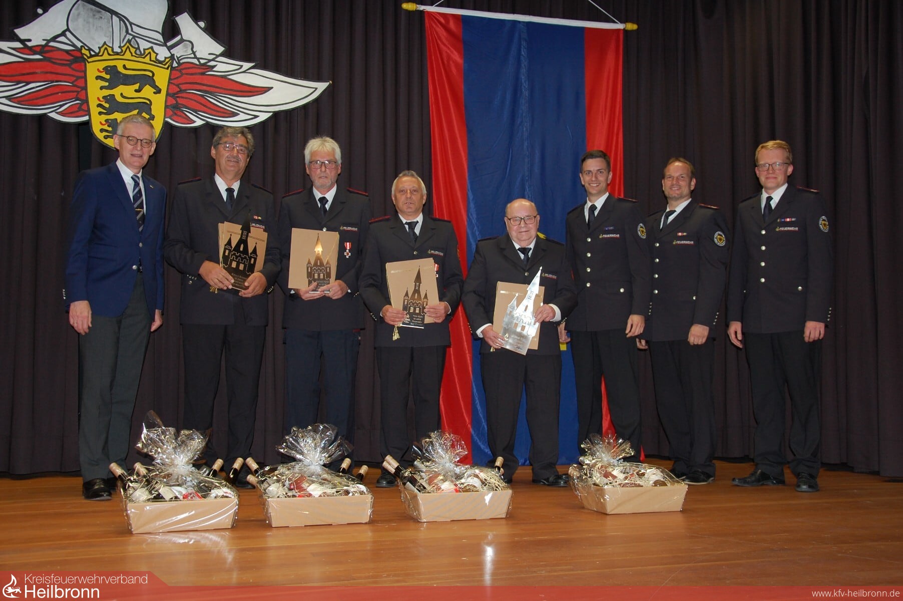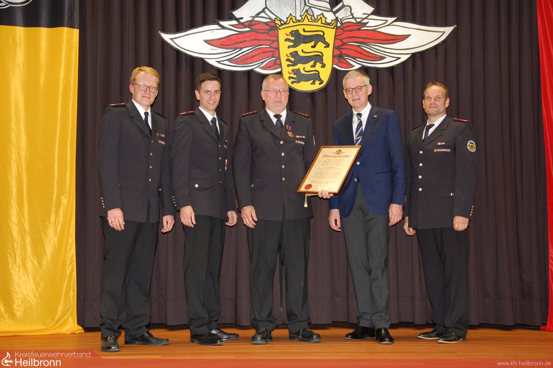 Schwierige Zeiten liegen hinter der Feuerwehr. Ausgefallene Dienste und Feste, fast keine Lehrgänge, und immer die Ungewissheit was Corona als nächstes mit sich bringt. Umso mehr freute es Jonas Teschler alle an diesem Abend begrüßen zu dürfen. Der Kameradschaftsabend ist ein kleines Dankeschön an die Feuerwehrangehörigen die jedes Jahr viele Stunden für die Sicherheit unserer Stadt und deren Bürger leisten. Gleichfalls ist der Kameradschaftsabend ein würdevoller Rahmen, um verdiente Kameraden zu ehren. Sein Dank galt auch den Partnern und Familien für die Toleranz, welche sie der Feuerwehr entgegenbringen. Da es seine letzte Rede als Bürgermeister an einem Kameradschaftsabend war, sprach Bürgermeister Brechter über die seinen ersten Kontakt zur Feuerwehr Bad Wimpfen, Einsätze und die gesellschaftlichen Ereignisse wie Jubiläen, Schlachtfeste, oder auch Kameradschaftsabende. Besonders bedankte er sich bei den drei Kommandanten Reinhold Korb, Martin Ramsperger und Jonas Teschler die ihn durch seine 32- jährige Amtszeit begleiteten. Als nächstes trat der Kreisfeuerwehrverbandsvorsitzende Reinhold Gall ans Rednerpult. Feuerwehr ein wichtiges Ehrenamt, Kameradschaftspflege, Attraktivität, Jugendfeuerwehr sind nur einige Schlagwörter die Gall in seiner Rede ausführte, bevor er über Martin Ramsperger sprach und ihm das Feuerwehr-Ehrenkreuz in Bronze verlieh. Ramsperger machte sich nicht nur als Kommandant und Stellvertreter verdient. Er war auch überörtlich im Kreisfeuerwehrverband Heilbronn tätig. Insgesamt 335 Jahre Mitgliedschaft konnte Bürgermeister Brechter ehren. Dies teilte sich in 15 Jahre, 40 Jahre und 50 Jahre Mitgliedschaft auf. Für 15 Jahre wurden geehrt: Tanja Ernst, Philipp Haspel, Michael Keller und der Kommandant Jonas Teschler. Für 40 Jahre aktiven Feuerwehrdienst standen die Kameraden Thilo Korb und Hartmut Knell sowie für 50 Jahre Wilfried Ullrich und Roland Schnell auf der Bühne. Bei den 40 und 50 jährigen Jubilaren nahm der stellv. Kommandant Fabian Lobitz der mittlerweile am Rednerpult stand die Anwesenden mit auf eine Zeitreise durch die Feuerwehrlaufbahn der einzelnen Kameraden, begleitet wurden seine Ausführungen durch ein Bilderpräsentation. Die Letzte Ehrung an diesen Abend erhielt Martin Ramsperger. Der Kommandant a.D. wurde aufgrund seiner herausragenden Leistungen und seiner Einsatzbereitschaft zum Ehrenmitglied der Freiwilligen Feuerwehr ernannt.