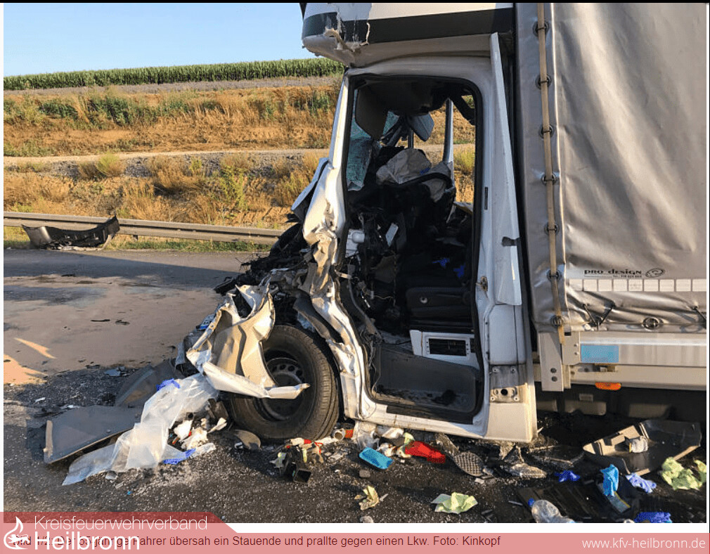 Ein 55 Jahre alter Fahrer eines tschechischen Sprinters übersah nach Angaben der Polizei gegen 18.30 Uhr auf der Autobahn 6 zwischen den Anschlussstellen Bad Rappenau-Fürfeld und Untereisesheim ein Stauende. Er prallte mit großer Wucht gegen die rechte hintere Ecke eines Sattelzugs. Der 55-Jährige starb noch an der Unfallstelle. Die Strecke Richtung Heilbronn war voll gesperrt. Massiv behindert wurden die Einsatzkräfte von Polizei und Feuerwehr, die zum Unfallort eilten.