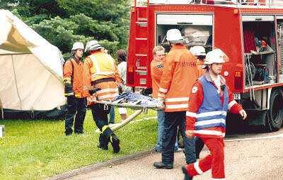 Starker Qualm Der Qualm wurde immer stärker und drang nach außen. Für die Feuerwehr war klar, wegen des starken Rauchs der oberen Fluren war der Einsatz von Atemschutzträgern erforderlich. Vor den Klinikgebäuden wurden die Drehleitern der Feuerwehren Bad Wimpfen und Bad Rappenau in Stellung gebracht. Es galt, vom Feuer und Qualm eingeschlossene Personen aus oberen Etagen zu retten. Erste Verletzte mit Brandwunden wurden mit Rauchvergiftungen und Brandverletzungen ins Freie gebracht, wo sie unverzüglich von den DRK-Helfern übernommen und versorgt wurden.