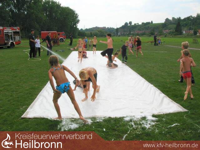 Attraktion war jedoch die Wasserrutsche auf dem Klingenberger Sportplatz. Auf einer mit Schmierseife und viel Wasser präparierten Fläche rutschen die Kinder in allen Lagen.