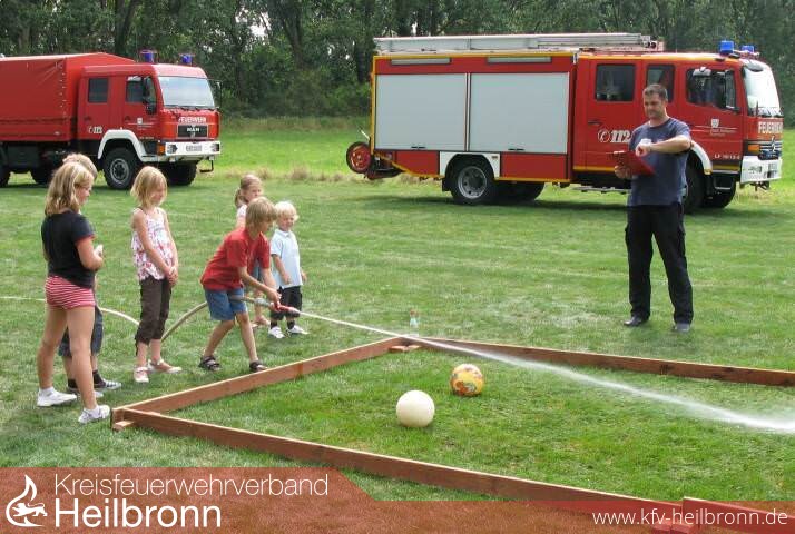 25 Kinder im Alter von 6 bis 12 Jahren durften spielerisch die Aufgaben der Feuerwehr kennenlernen. Während sich die Jüngeren an verschiedenen Geschicklichkeitsspielen wie Zielspritzen, Schlauchkegeln, Wassertragen über eine Leiter versuchen durften, haben die Älteren den Ablauf eines Löschangriffes einstudiert.