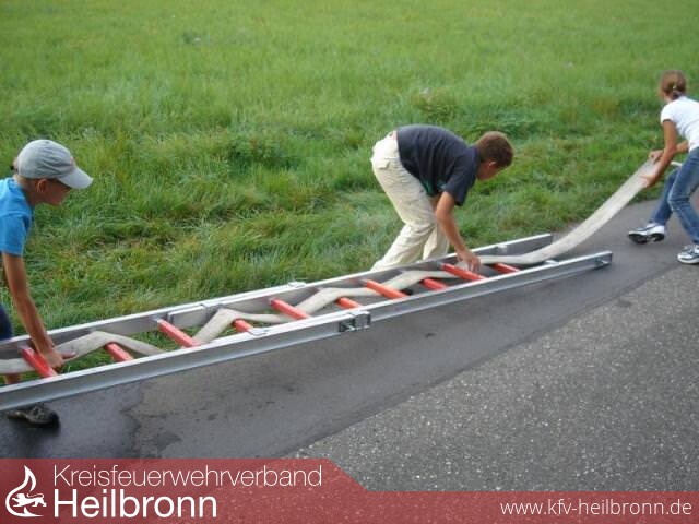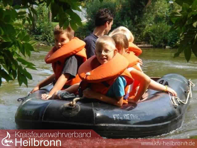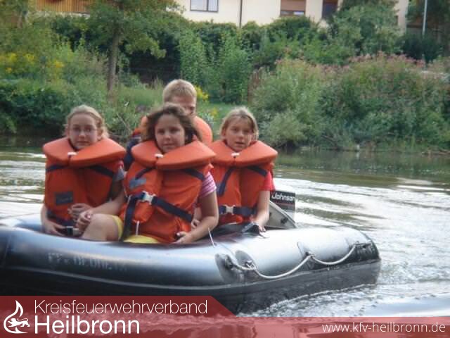 Zu Beginn stand eine Führung durch das Feuerwehrhaus auf dem Programm, wobei die teilnehmenden Kinder u.a. die Funkzentrale, die Fahrzeuge und Einrichtungen und selbstverständlich auch den Jugendfeuerwehrraum in Augenschein nehmen durften. Danach ging es rasch Richtung Kocher, dort durfte mit dem Schlauchboot durch ein Parcours gefahren werden, weiterhin durfte gefunkt und eine Wasserförderung mit Hindernissen bewältigt werden. Zurück am Feuerwehrhaus, wurde dann Fußball gespielt, aber nicht auf die gewöhnliche Art, sondern jede Mannschaft bekam zwei C-Rohre mit kräftigem Druck und mußte damit den Ball ins gegnerische Tor bugsieren. Danach waren alle „patschnass“ bis auf die Haut, aber es hat riesigen Spass gemacht.