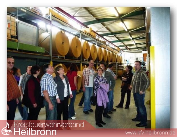 Nach dieser Stärkung stand bereits das nächste Highlight an, nämlich die Besichtigung der größten Firma am Ort, der Firma Pucaro, welche mit 350 Beschäftigten Elektroisolierstoffe herstellt. In der Pucaro gab es eine Begrüßung und Einweisung durch den verantwortlichen Leiter der Werksicherheit, Herrn Czernuska. Danach wurden 3 Gruppen gebildet und durch das weitläufige Werk, in welchem rund um die Uhr und auch das ganze Jahr über, außer am 24.12. und am 1.1. gearbeitet und produziert wird, geführt. Die Besichtigung stellte sich als einmalige Gelegenheit für alle Anwesenden heraus, kaum jemand wusste was und wie aufwändig hier produziert wird. Fast alle aus der Gruppe kannten das Werk von innen überhaupt nicht. Auch hier dauerte die Führung gute zwei Stunden an und die Gesellschaft wurde anschließend mit einem Präsent verabschiedet. Auch hier erhielten die drei Führer ein Weinpräsent vom Möckmühler Kommandanten überreicht, welcher noch darauf hinwies, dass solch mittelständische Unternehmen in solchen Orten gebraucht würden, dass die Gemeinden nur mit solchen Arbeitgebern überleben können und, dass die Roigheimer wohl wissen, was sie an „ihrer“. Pucaro haben. Immerhin wurde die Firma im Januar zum „Partner der Feuerwehr“ ernannt.