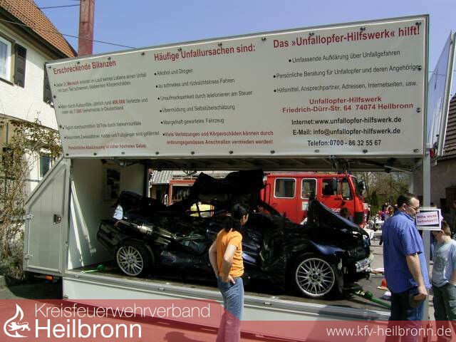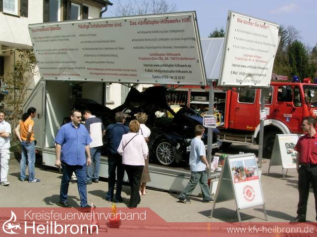 Wie Sie bereits aus unseren vorhergehenden Informationen wissen, stellt das Unfallopfer-Hilfswerk im Rahmen seiner aktiven Verkehrssicherheitsarbeit Feuerwehren, Rettungsorganisationen, der Polizei usw. einen Schauanhänger, bestückt mit einem originalen Unfallwagen, als Anschauungsmaterial kostenlos zur Verfügung. An dem Unfallfahrzeug ist der Einsatz von Spreizer, Schere usw. dargestellt.
