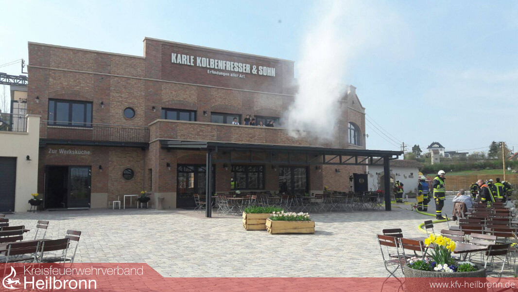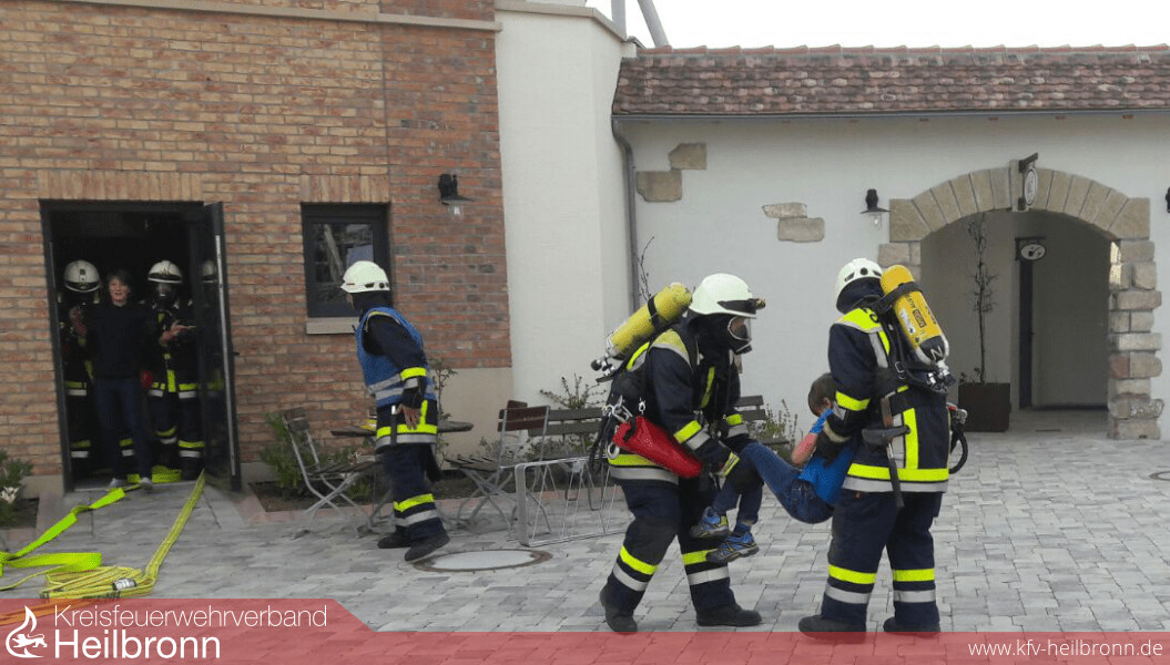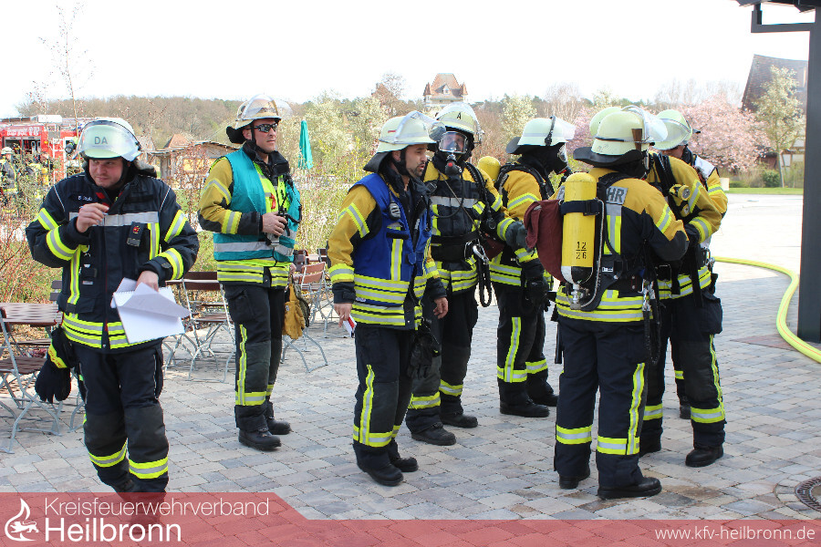 Die verletzten Küchenkräfte wurden von der zuerst eintreffenden Feuerwehr Cleebronn unter Atemschutz aus dem Gefahrenbereich gebracht. Anschließend wurde ein Innenangriff vorgenommen. Die im Obergeschoss eingeschlossenen Tagungsteilnehmer wurden von den Feuerwehren Bönnigheim und Brackenheim über mehrere tragbare Leitern und mit Fluchthauben über das Treppenhaus vom Balkon des Gebäudes gerettet. Zusätzlich machte sich auf dem Dach des Gebäudes noch ein Monteuer kenntlich der an der Lüftungsanlage eine Wartung durchführte. Er musste über die Drehleiter der Feuerwehr Brackenheim gerettet werden. Im Anschluss musste die Drehleiter zu einer Menschenrettung mittels Schleifkorbtrage und Rollgliss eingesetzt werden. Durch Unvorsichtigkeit ist eine Person im hinteren Bereich des Balkons in die Tiefe gestürzt und hat sich dabei schwer verletzt. Eine weitere verletzte Person ist vor Panik nach dem sie vom Balkon geholt wurde zuerst unbemerkt davongerannt und hat sich im Freizeitpark versteckt. Sie musste von mehreren Trupps gesucht werden.