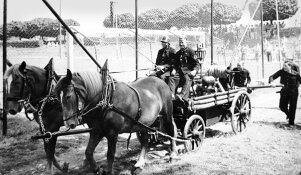 Bild: Historisch: Die Horkheimer Feuerwehr beim Heimatfest 1957. Auf dem Kutschbock der Handdruckspritze sitzen Otto Reisig und Wilhelm von Olnhausen.Foto: Feuerwehr