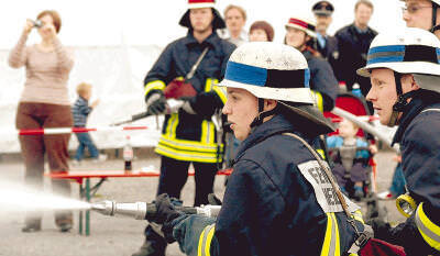Bild: Wasser marsch! Anders als bei den Schauübungen zielen die Wehrleute bei der Leistungsprüfung nicht auf Flammen, sondern auf Kunststoffscheiben (Foto: Alexander Hettich, HSt)