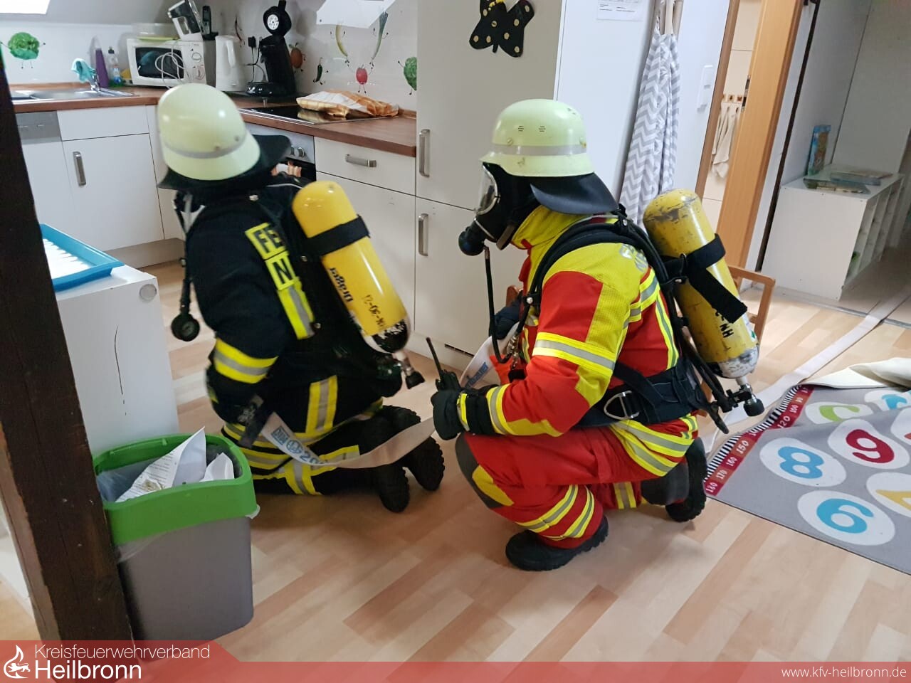 Ein weiterer Trupp des nun eingetroffenen Gerätewagen-Logistik (GW-L2) wurde vom Eingang auf der Gebäuderückseite zur Brandbekämpgung ins zweite OG vorgeschickt, wo eine Küchenzeile in Brand geraten war. Der Trupp fand den Brandherd und löschte das Feuer.