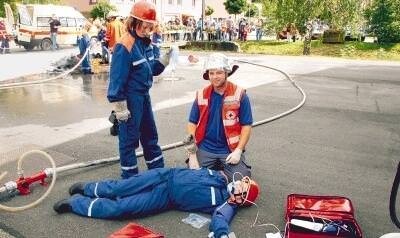 Bild: Die Ersthelfer des Deutschen Roten Kreuzes mussten Verletzte versorgen. Im Hintergrund der Schaumteppich und die verkohlten Reste der Übungshütte. (Foto: Werner Stuber)