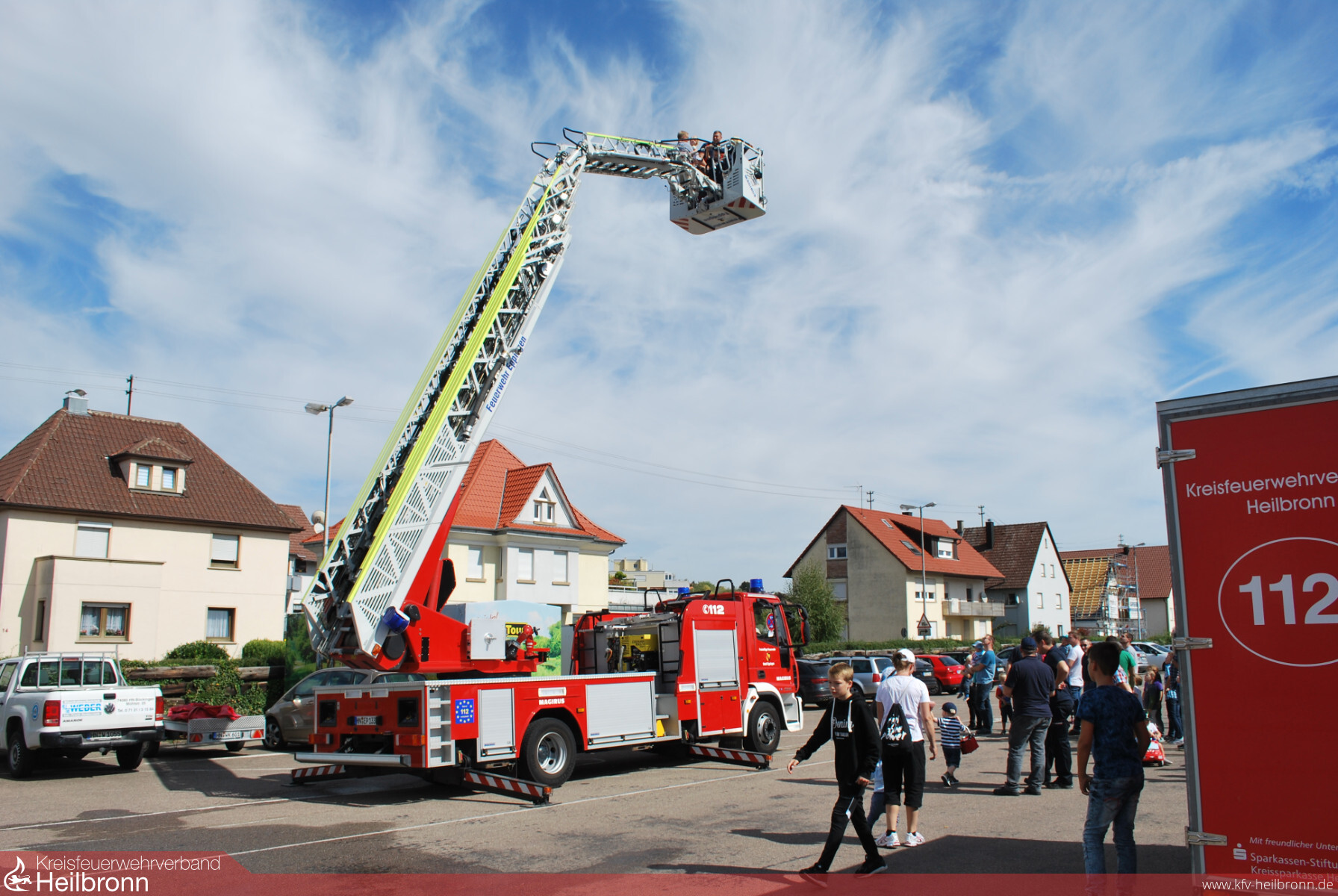 Viel bestaunt wurde die 30 Meter hohe Drehleiter der Eppinger Feuerwehr. Der Bevölkerung bot sich die Möglichkeit, einen nicht alltäglichen Ausblick aus der Vogelperspektive zu genießen. Jugendliche und Erwachsene nutzten die Gelegenheit und nahmen dafür gerne Wartezeiten in Kauf. Auch Jonas ließ sich mit seinem Vater im Drehleiterkorb in die Höhe befördern. „Ich habe den Kirchturm und viele Häuser von oben gesehen“, schwärmte der Vierjährige, als er wieder festen Boden unter den Füßen hatte.