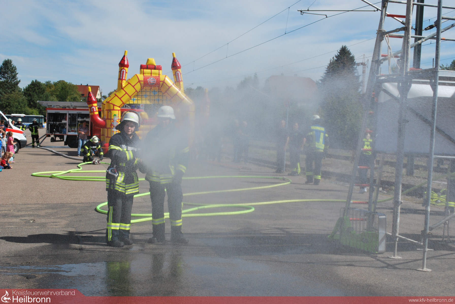 Gerne in Anspruch genommen wurde auch der Spielparcours der Jugendfeuerwehr, bei dem die kleinen Besucher mit dem Wasserschlauch auf eine Hausattrappe spritzen durften.