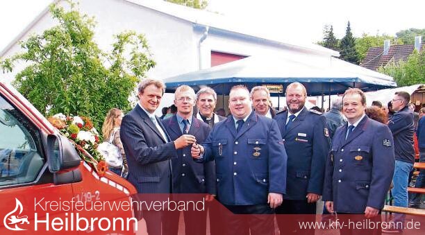 Bild: Bürgermeister Stefan Thoma (links) übergibt den Schlüssel für das neue Fahrzeug, im Hintergrund ist der Magazinanbau. (Foto: Karin Freudenberger)