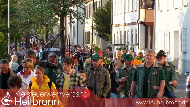 Prozession Eine endlos lange Prozession mit mehr als 400 Teilnehmern aus 17 Vereinen, jeweils in Uniform, Tracht oder wenigstens symbolisch mit ihrer Ausrüstung bewaffnet, formierte sich beim Friedhof, um sich von dort über die Roigheimer Straße, Hauptstraße und Züttlingerstraße zum Sportheim zu bewegen.