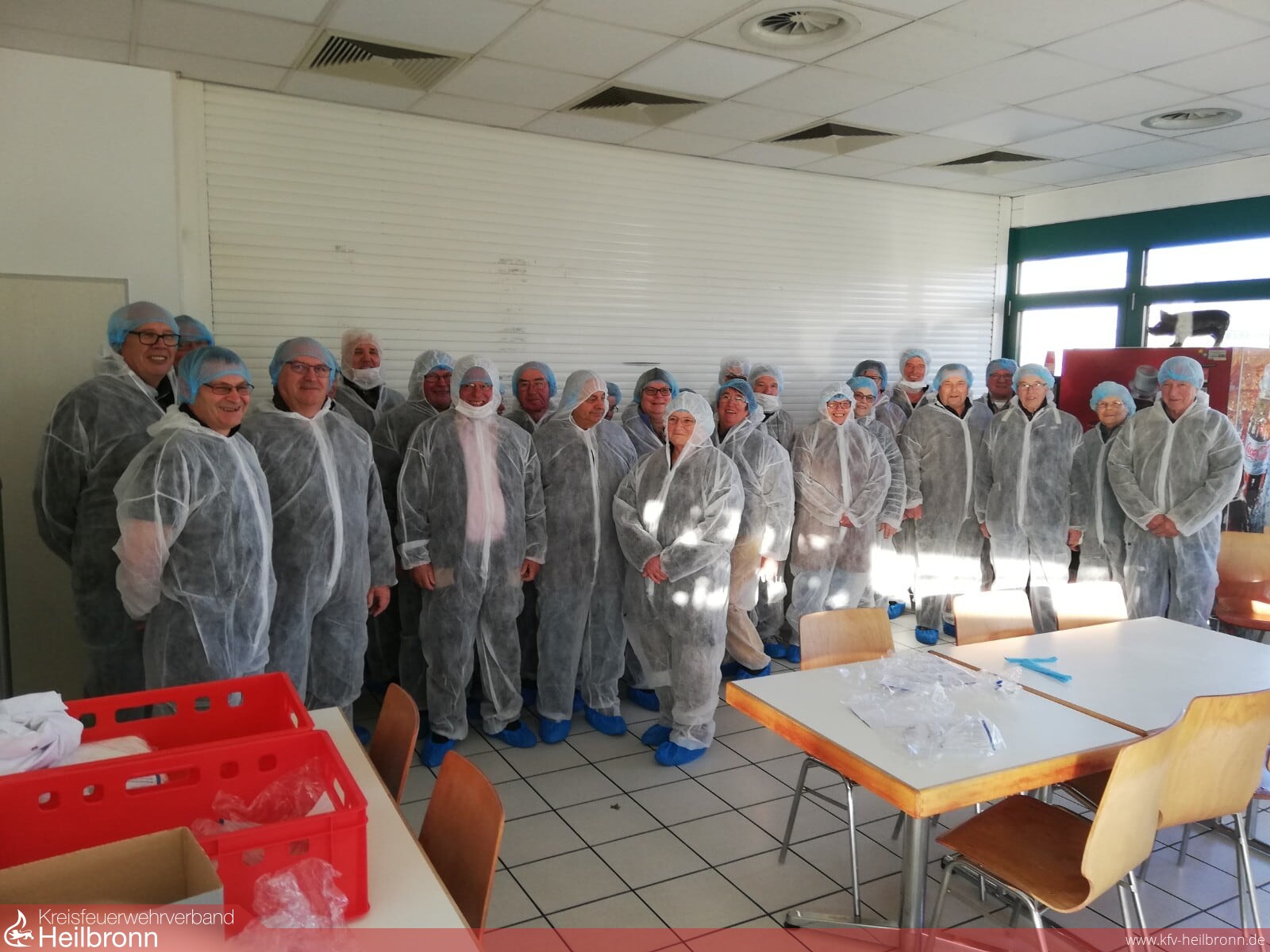 Unsere Gruppe wurde von Herrn Rainer Höhn durch den modernen Betrieb geführt. Zuvor mussten aus hygienischen Gründen von allen Teilnehmern die zur Verfügung gestellten Schutzanzüge, Haarnetze und Überschuhe angelegt werden. Schon im Voraus wurde den Teilnehmern die Sicherheitshinweise des Betriebs für Besucher bekanntgegeben. Verständlicherweise bestehen bei Lebensmittelverarbeiteten Betrieben strenge Hygienevorschriften. So dürfen z.B. bei dem Besuch keine Uhren und Schmuckstücke getragen werden, Barttraeger müssen neben dem Haarnetz, welches Haare und Ohren vollständig bedecken muss, auch einen zusätzlichen Mundschutz tragen. Durch eine Hygieneschleuse, in der Hände gewaschen und desinfiziert werden mussten, ging es in den Betrieb.