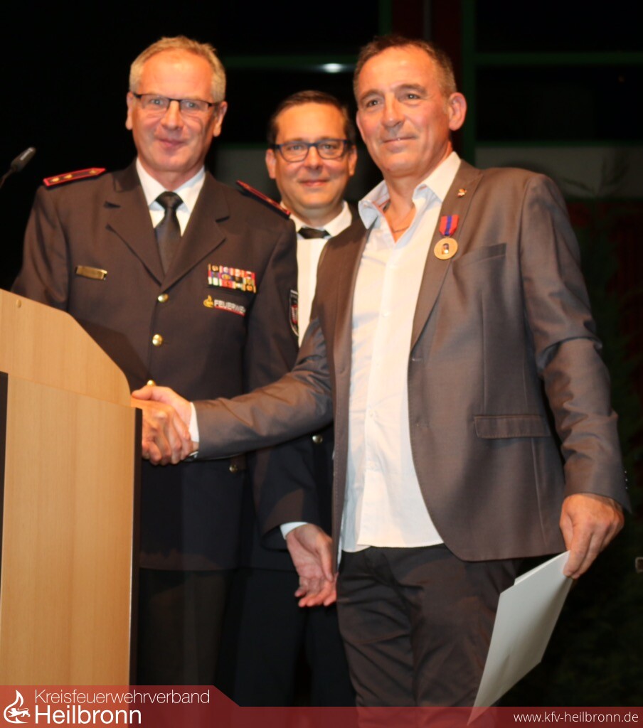 Anlässlich der Partnerschaftsfeier zum 60-jährigem Jubiläum der Städtepartnerschaft Neckarsulm-Carmaux überreichte der Verbandsvorsitzende Reinhold Gall die Medaille für internationale Zusammenarbeit an Lieutant Daniel Goulignac.