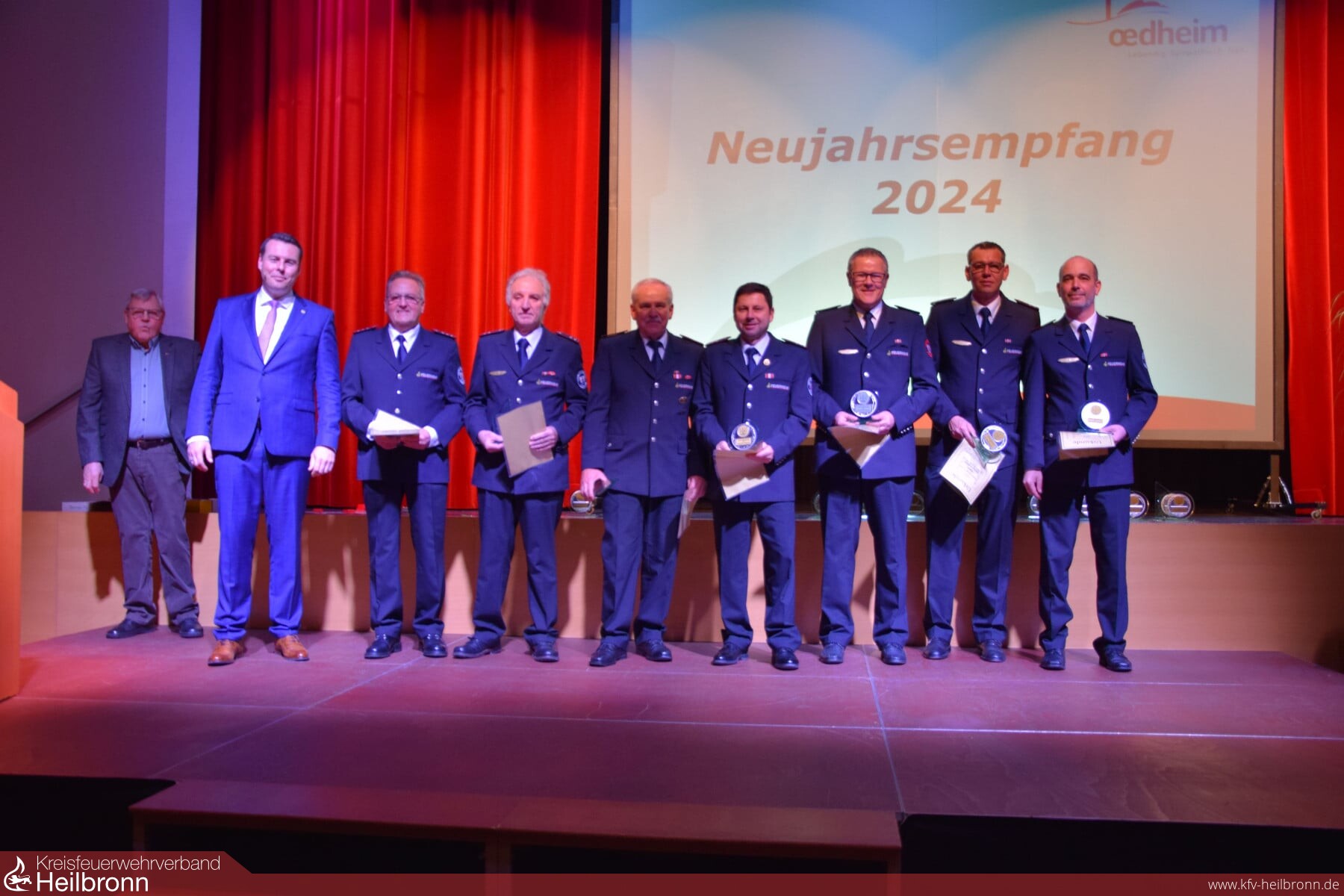 Beim diesjährigen Neujahrsempfang der Gemeinde Oedheim in der Kochana konnten neben vielen Ehrenamtlichen und Sportlern auch mehrere Kameraden der Freiwilligen Feuerwehr Oedheim durch Bürgermeister Matthias Schmitt und Stellvertreter Josef Denzer für deren langjähriges Engagement in Führungsaufgaben der Feuerwehr ausgezeichnet werden.