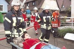 Bild: Bergung einer „verletzten" Person: Das Zusammenspiel der Zaberfelder Einsatzkräfte von Feuerwehr und DRK klappte gut.Foto: Werner Stuber