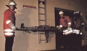 Abgeseilt Die THW-Helfer retteten eine der Personen auf spektakuläre Weise. Bei der so genannten waagerechten Menschenrettung wurde ein Verletzter auf seiner Trage mittels Leiter von einem Vordach geborgen. Dabei wird die Trage an der Leiter befestigt, diese dann vom Gebäude weggekippt. Mit Seilen wird die Trage vom Dach aus gesichert.