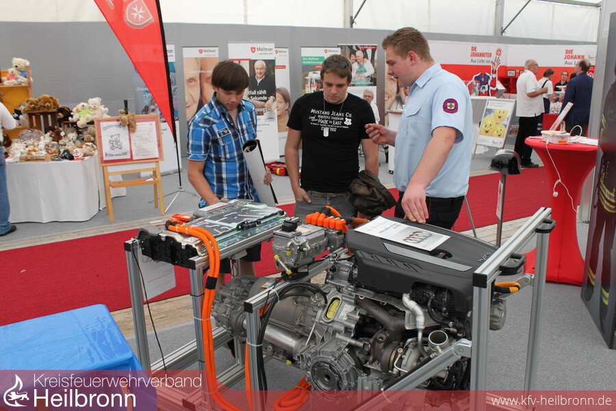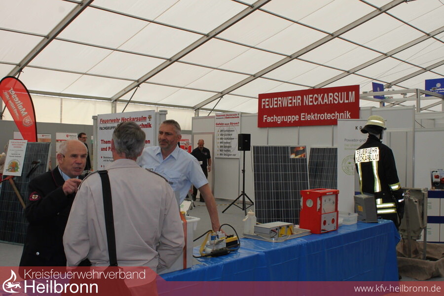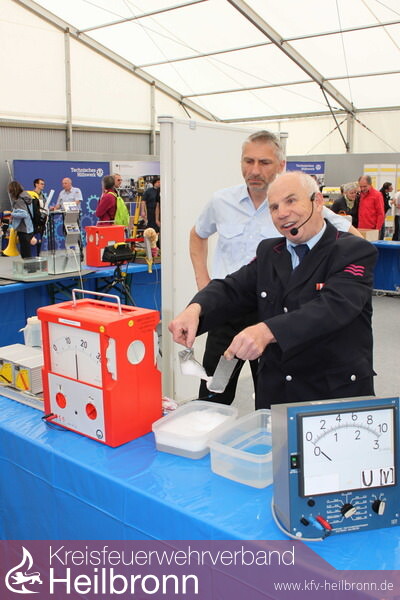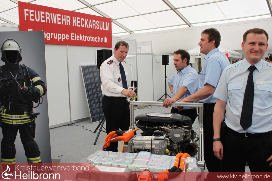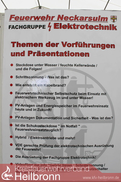 Nicht zu unterschätzen ist die Gefahr durch elektrischen Strom für die Frauen und Männer der Feuerwehr bei Einsätzen. Er kann für sie, und gleichermaßen für die geschädigten Bewohner, schnell zur tödlichen Falle werden. Diese Risiken durch Aufklärungsarbeit zu minimieren macht sich die 2011 gegründete Fachgruppe Elektrotechnik zur Aufgabe. Der engagierte Feuerwehrmann Kern baute die 12-köpfige Gruppe auf, die in Fachkreisen hohes Ansehen genießt und mit ein Aushängeschild der Neckarsulmer Wehr ist. Die Fachwelt ist voll des Lobes für diese richtungsweisende Fachgruppe und erfreut über die Präsentationen und Darbietungen zu den Themen: sicherer Umgang mit Elektrizität, Gefahr durch Strom, Photovoltaik, Schrittspannung, Achtung - Wasser ist elektrisch leitend, Elektromobilität, elektrische Energiespeichersysteme. So waren beim Maimarkt, wie schon im Jahre zuvor, unzählige interessierter Messebesucher begeistert von den Darbietungen und verständlichen Erklärungen durch die Neckarsulmer Feuerwehr.