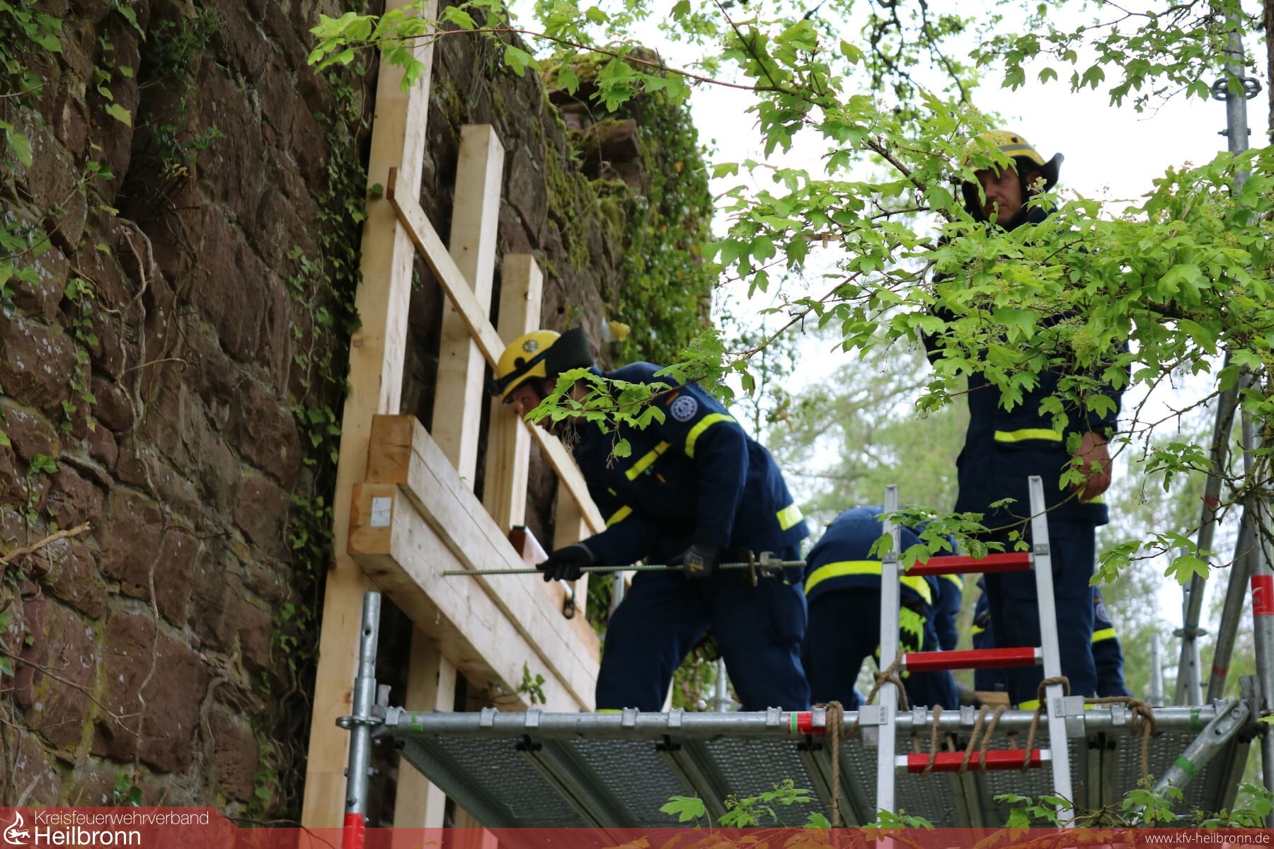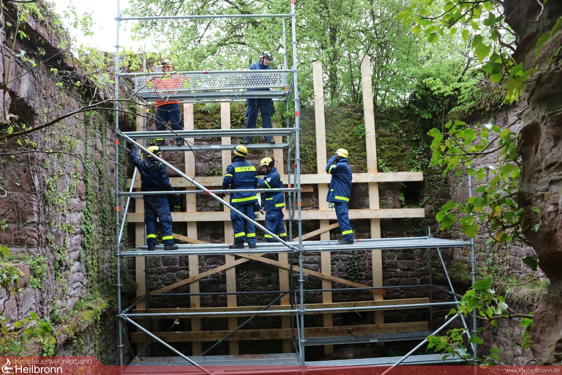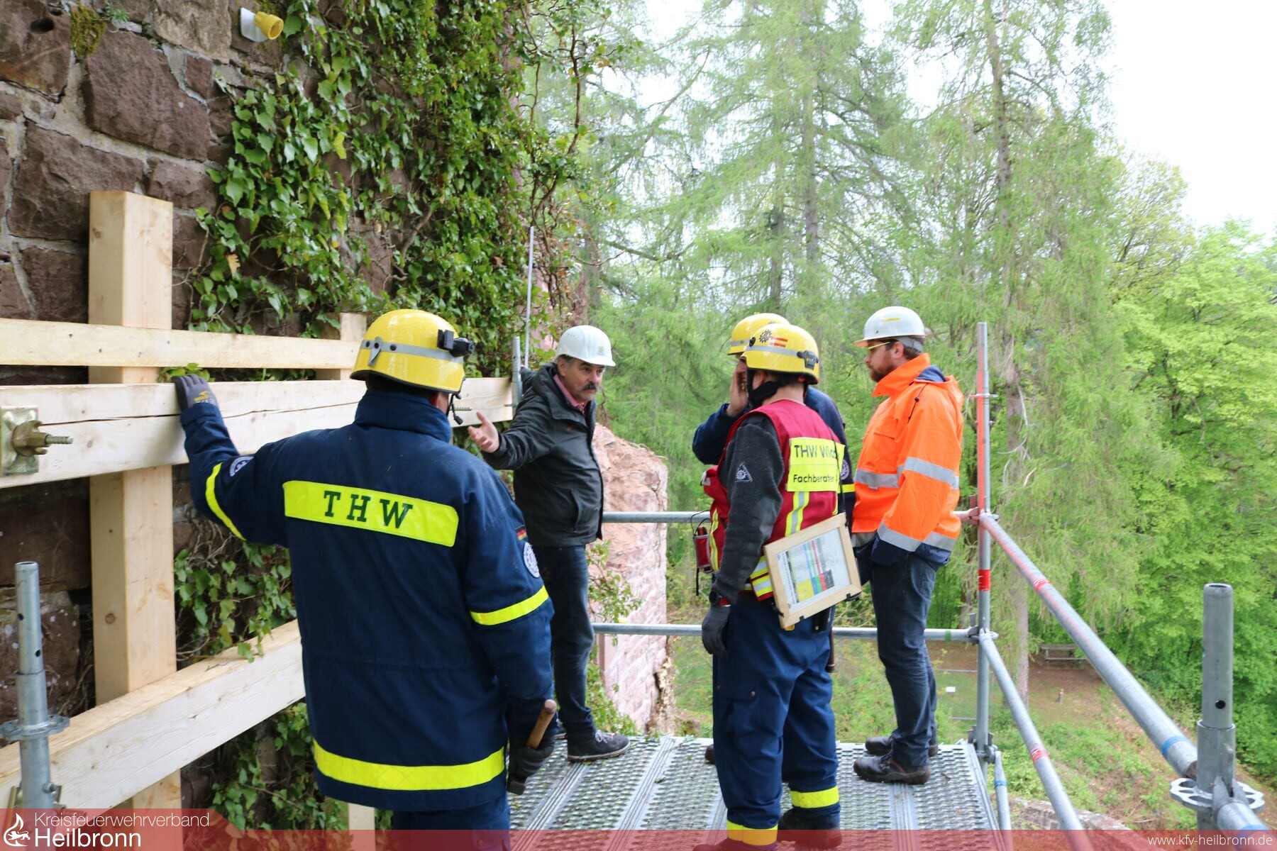 Um Bewegungen der weiter akut einsturzgefährdeten Bereiche sichtbarzumachen, installierte der THW Ortsverband Ladenburg ihr Einsatzstellen-Sicherungs-System (ESS). Mit dem ESS werden Einsatzstellen überwacht, um die Rettungskräfte rechtzeitig vor drohenden Gefahren zu warnen. Gegen 8:45 Uhr traf die restliche ASH Einheit aus Widdern ein. Hier gilt dem THW OV Weinsberg unser großer Dank, da dieser uns für diesen Einsatz einen Gerätekraftwagen (GKW) mit Fahrer zur Verfügung stellte, weil unser eigener GKW nicht zur Verfügung stand. Nachdem die Tragwerkskonstruktion geplant und besprochen war, wurden Arbeitsplattformen aus dem EGS des THW erstellt. Gegen 11:00 Uhr konnte dann, bereits früher als gedacht, mit den Hilfskonstruktionen begonnen werden. Durch die permanenten Messungen und Überwachungen des ESS-Trupps wurde der Bereich des betroffenen Mauersegments für die Arbeiten freigegeben und es konnte mit der Korsettierung der Mauer begonnen werden. Die Arbeiten wurden ständig vom Baufachberater des OV Haßmersheim und vom Fachpersonal aus der ASH-Einheit aus Widdern begleitet. Im Anschluss wurde der noch kritische Bereich mit Dachplanen so abgedeckt, dass keine weitere Feuchtigkeit in das Mauerwerk eindringen kann. Damit sollen weitere Schäden minimiert werden. Während ein weiterer Schadensschwerpunkt gesichert wurde, konnten Plattformen, die nicht mehr benötigt wurden, abgebaut und abtransportiert werden. Die Sonderholzkonstruktion für das Abstützen der Gebäudeecke wurde erst am Zuschnittplatz des OV Widdern vorgefertigt und dann am Schadensort eingesetzt.