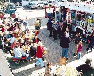Mit großer Aufmerksamkeit verfolgten die Gäste die Löschvorführungen der Feuerwehr. Vor allem das neue Tanklöschfahrzeug, aber auch die Rundfahrten mit der Drehleiter für Kinder waren die Publikumsmagneten. Emsige Bedienungen, unterstützt von den Jungs und Mädchen aus der Jugendabteilung, sorgten für eine schnelle Versorgung der Gäste. Die Küche brauchte sich über mangelnde Nachfrage nicht zu beklagen. Schnell waren die von den Feuerwehrfrauen und -müttern gebackenen leckeren 120 Kuchen und Torten vergriffen.